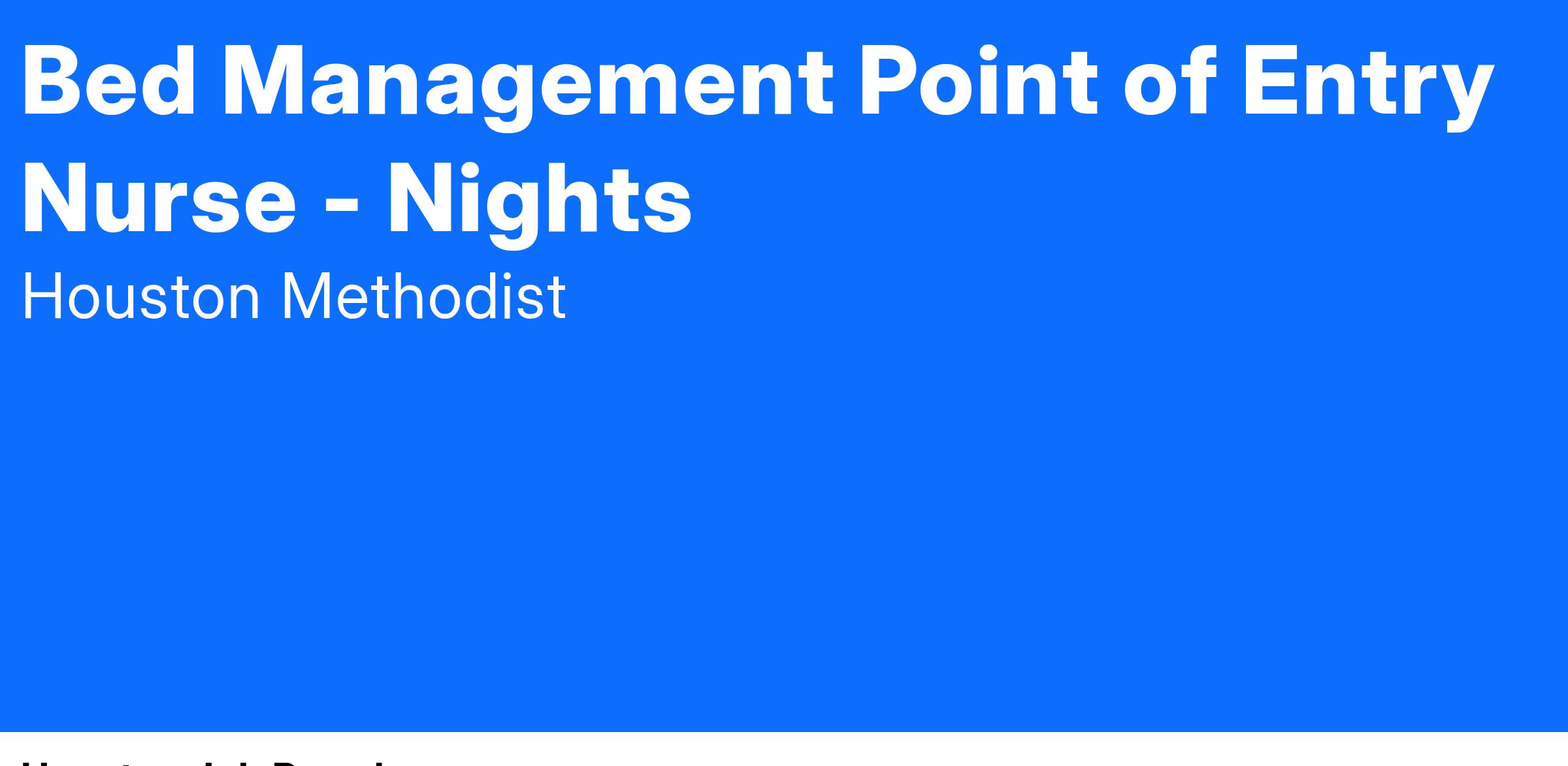 At Houston Methodist, the Point of Entry Nurse (POE) is a licensed registered nurse (RN) who responsible for facilitation of the functional and operational aspects for patients' entrance into the hospital. This position provides support to hospital units through the facilitation and coordination of patient flow and bed utilization. The POE Nurse position collaborates with clinical staff and interprofessional health care team to ensure resource utilization is appropriate to the patient's clinical needs and within covered benefits. This position ensures a compassionate, integrated, multi-disciplinary case approach which supports health caregivers to provide the highest quality, most clinically appropriate admission placement of patients, while promoting the most cost-effective utilization of the hospital's resources for those patients admitted to the hospital. The POE Nurse position ensures the most appropriate placement of patients as it relates to floors, rooms and campus, evaluating current and future needs for optimal patient care and reviews for intake and placement, external patients are clinically appropriate.