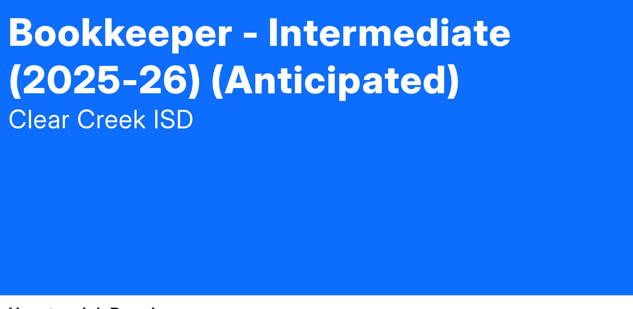 Provide bookkeeping services on an intermediate campus including all provisions of activity fund procedures and GAAP, which ensuring compliance with district financial policies. Actively engage in actions that contribute to the overall mission and strategic plan of Clear Creek ISD.