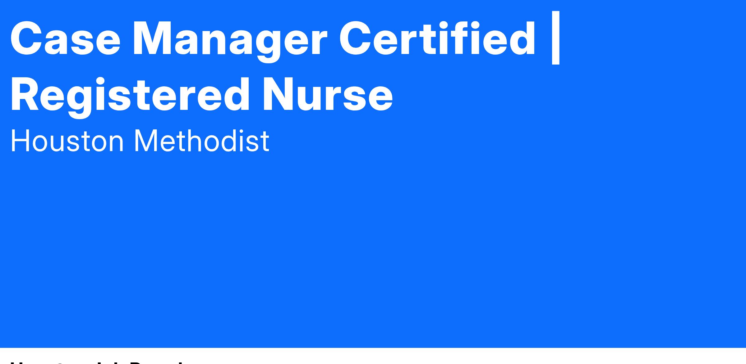 At Houston Methodist, the Case Manager (CM) Certified position is a registered nurse (RN) responsible for comprehensively planning for case management of a targeted patient population on a designated unit(s) and/or service line. This position works with the physicians and interprofessional healthcare team to facilitate and maintain compassionate, efficient quality care and achievement of desired treatment outcomes. The CM Certified position holds joint accountability with social workers for discharge planning and continuity of care and assures that admission and continued stay are medically necessary, communicating clinical information to payors to ensure reimbursement. In addition to performing the duties of a CM, this position helps drive change by identifying areas where performance improvement is needed, e.g., day-to-day workflow, education, process improvements, patient satisfaction.