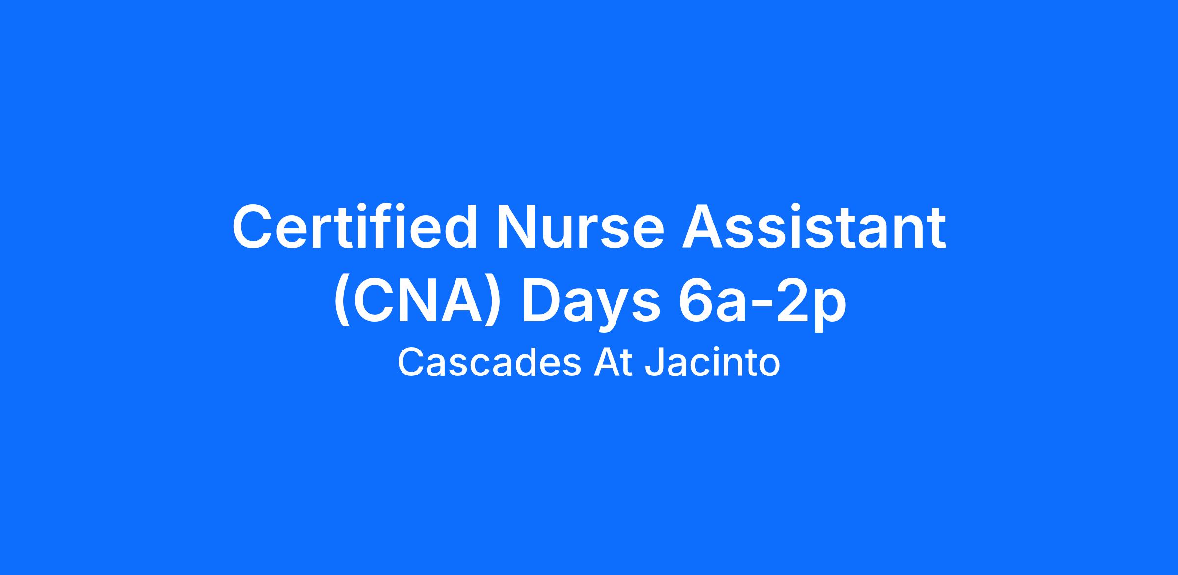 Cascades at Jacinto is a fantastic skilled nursing facility located in Houston, TX. We are expanding our nursing team and we are excited that you've considered us. If you want a supportive team beside you, grateful residents around you, and a place to grow as a CNA - you've found it!