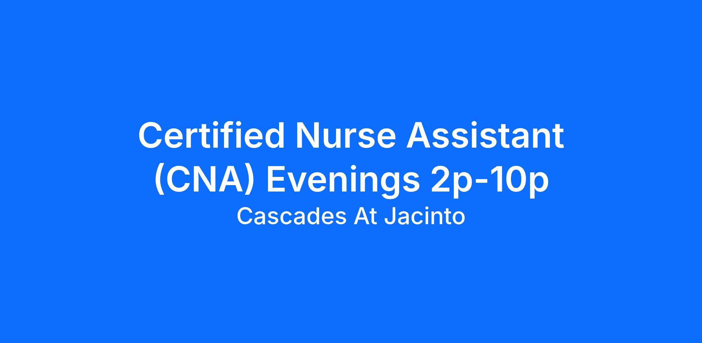Cascades at Jacinto is a fantastic skilled nursing facility located in Houston, TX. We are expanding our nursing team and we are excited that you've considered us. If you want a supportive team beside you, grateful residents around you, and a place to grow as a CNA - you've found it!