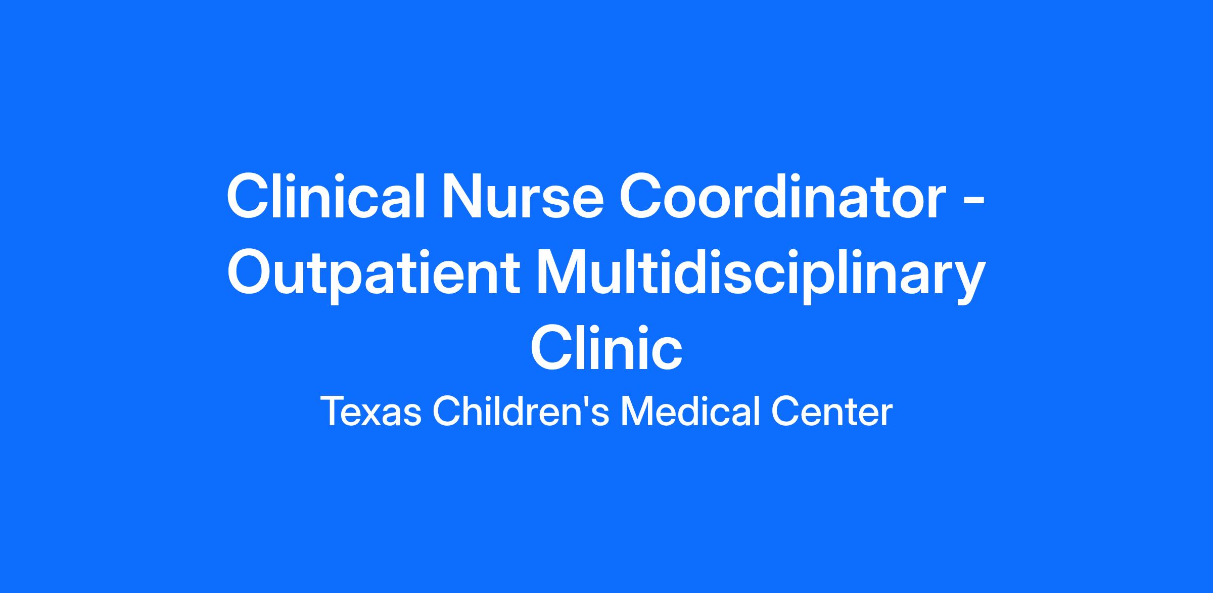 We are searching for a Clinical Nurse Coordinator with Texas Children's Outpatient Multidisciplinary Clinic in The Medical Center — someone who works well in a fast-paced setting. In this position, you'll provide direct and telephone nursing care, health teaching, patient advocacy, supervision and coordination of care given by others, and the coordination of services required for patients outside the ambulatory care setting in a manner that is age and developmentally appropriate.