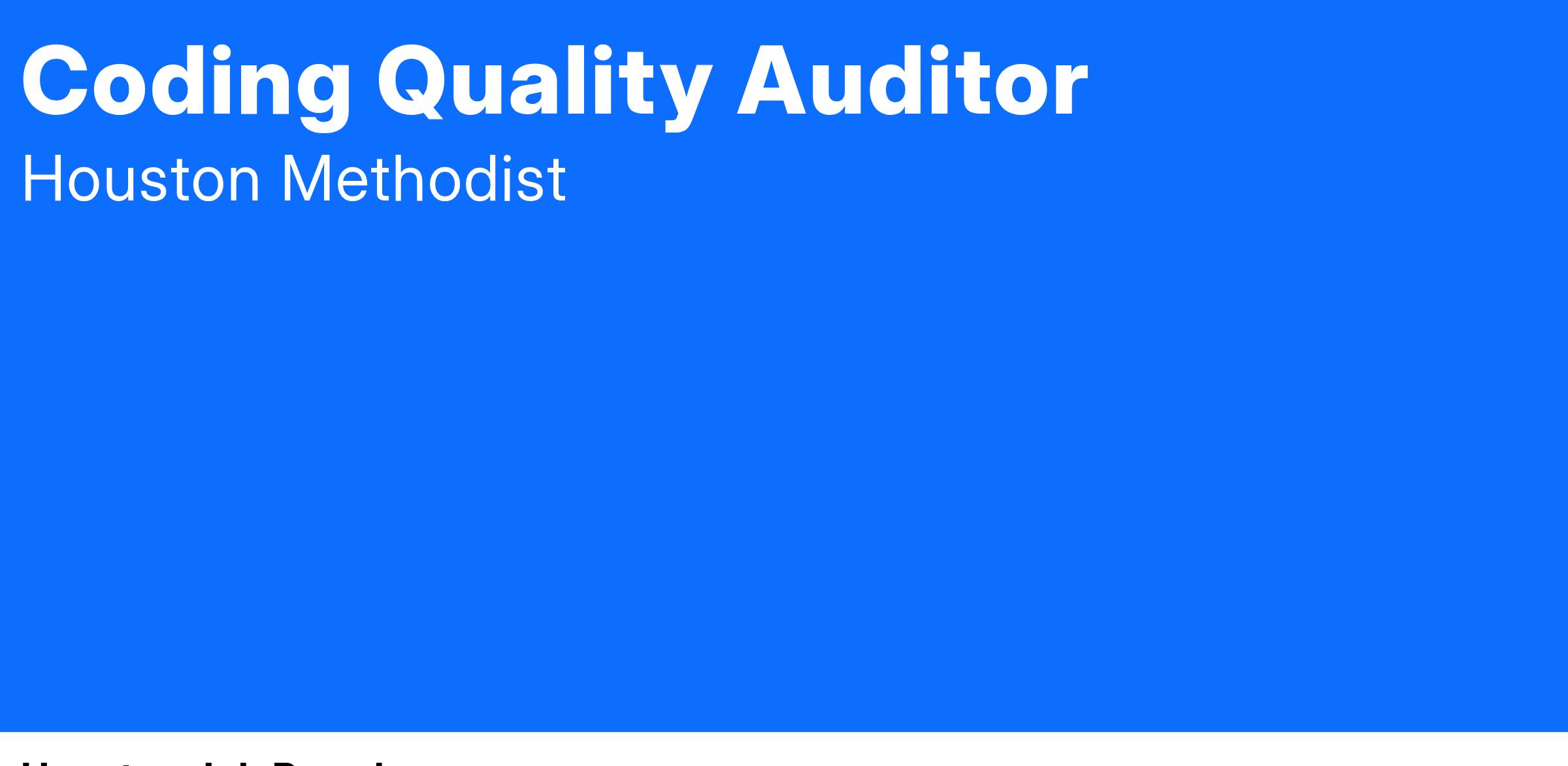 At Houston Methodist, the Coding Quality Auditor position is responsible for ensuring accuracy in code assignment of diagnosis and procedure to outpatient and/or inpatient encounters based upon documentation within the electronic medical record while maintaining compliance with established rules and regulatory body guidelines. This position performs data quality review to ensure data integrity, coding accuracy, and revenue preservation. Additional duties include participating in quality review and performance improvement projects throughout the department and/or facility.