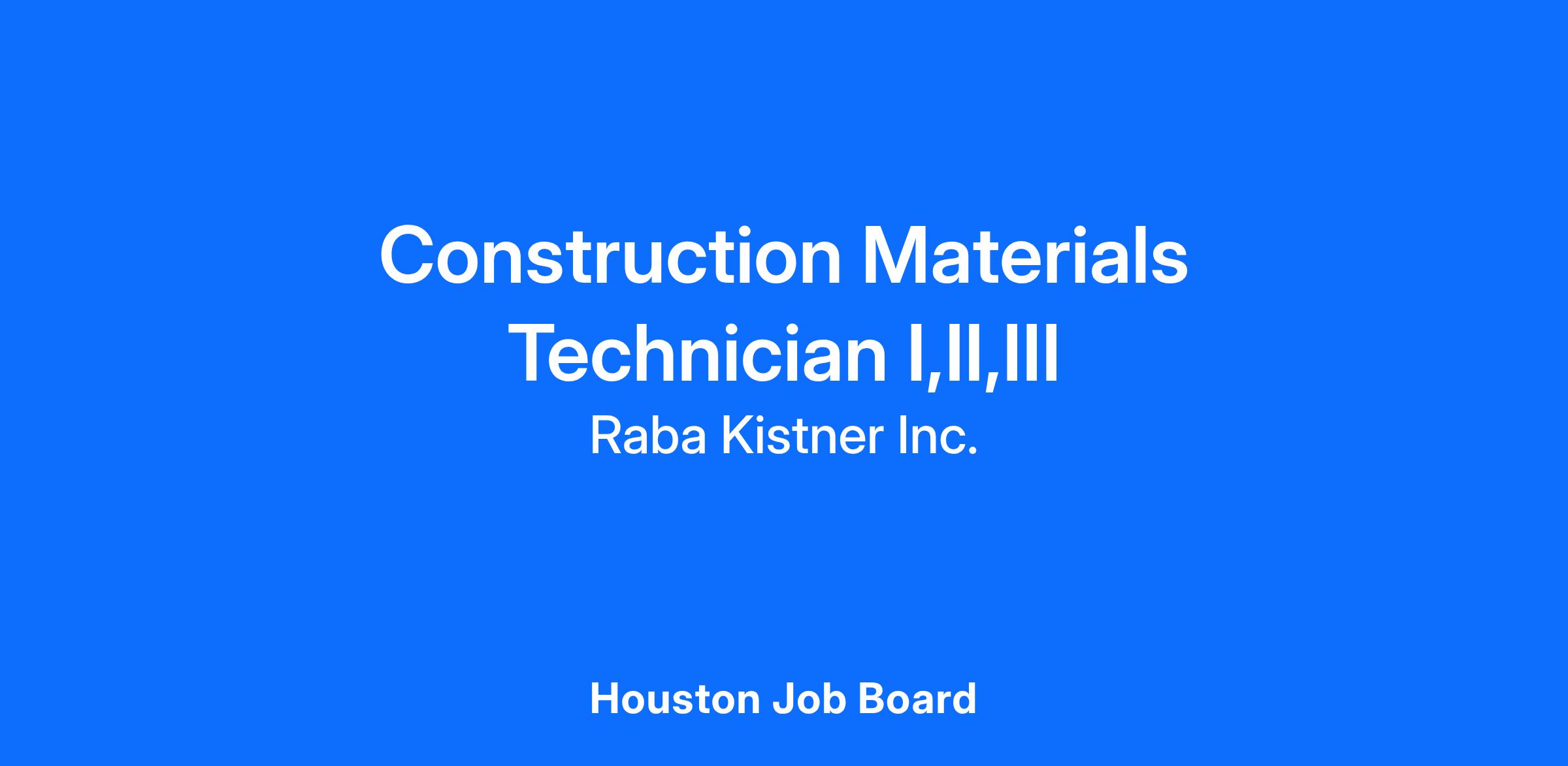 Raba Kistner is seeking a Construction Materials Technician I, II, or III to join our Consultants team in either Houston, Conroe, or La Porte TX. The Construction Materials Technician is responsible for conducting field or laboratory testing, sampling, and/or inspection services. Responsibilities include: