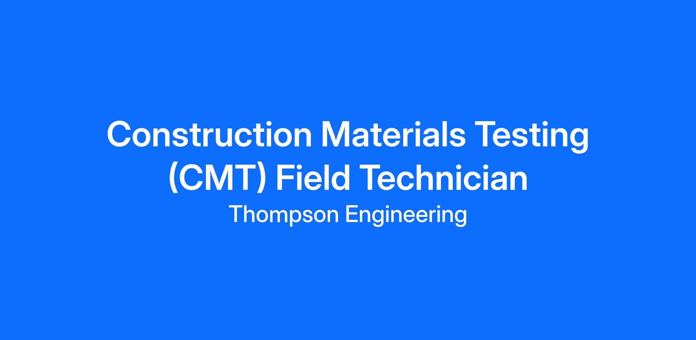 Thompson Engineering is looking for qualified Construction Materials Testing (CMT) Technicians for various locations. This position is responsible for the daily oversight of the construction materials testing and inspection on construction sites to ensure specified standards of quality are met. Preferred candidates would need to be open to travel to various jobs sites and locations as required.