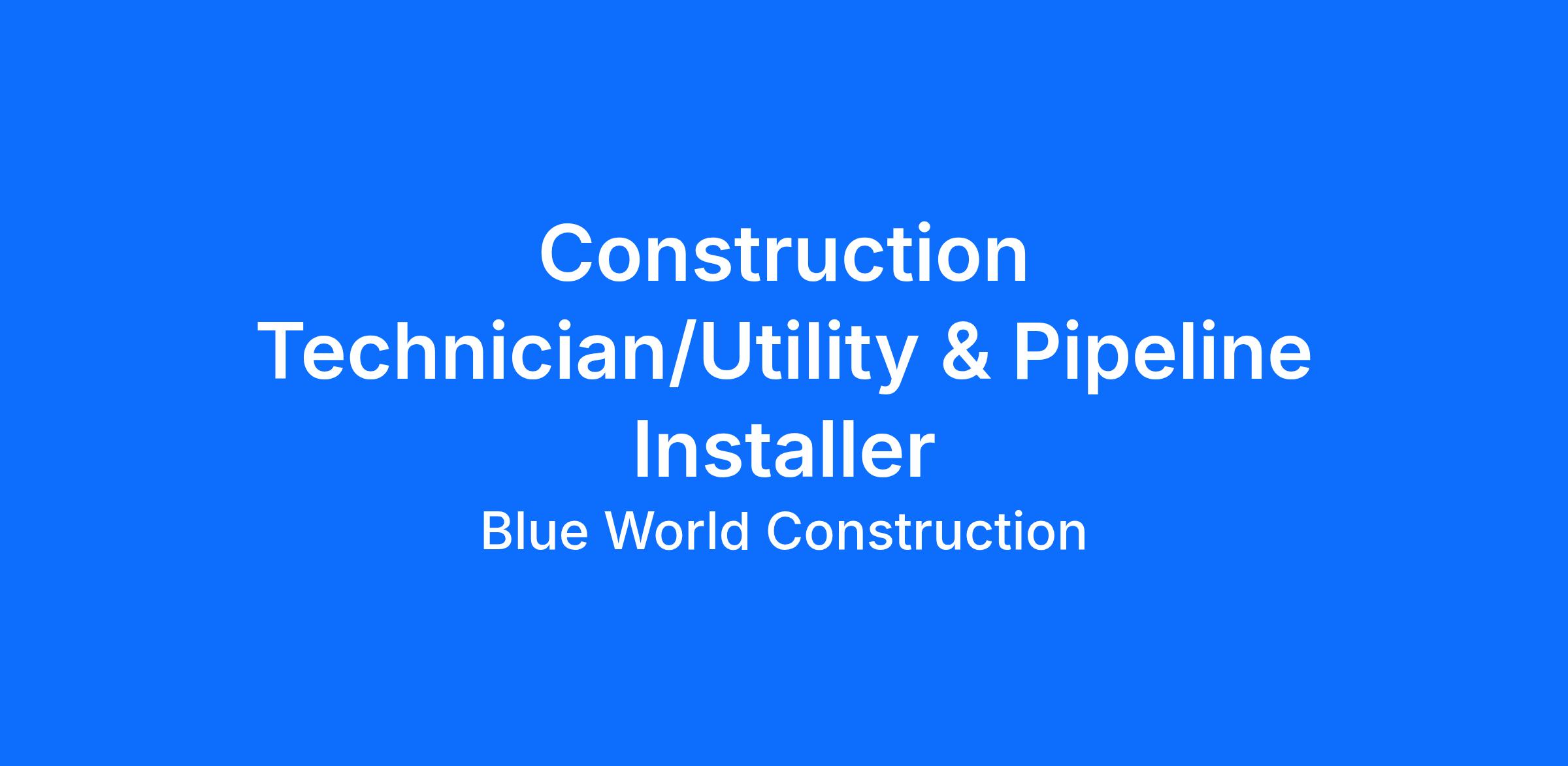 Blue World Construction is seeking highly motivated, self-starters for the position of Construction Technician/Pipeline Installer. The desired candidate must have previous hands-on construction experience with construction-related field activities such as installation of underground water line, sanitary line, and stormwater lines; working on heavy construction sites, exposed to HDPE butt/electro-fusion welding, above and below ground process pipe installation, concrete/form setting, welding of pipe and structural steel and repairs, rigging and fabrication, and working varied shifts in the field under various climates. This is a true 'jack-of'all-trades' position. The ideal candidate must have a good work ethic, a willingness to learn new skills, have a team mentality, and must be safety-oriented in all situations and environments. The candidate will be required to take direction from the project manager(s) and site superintendent, and work independently as well as potentially lead small crews in various tasks. This position requires an ability to perform various types of skilled labor as well. There is definite opportunity for growth and promotion for those individuals that promote teamwork, lead by example, can learn on the fly, and require little direction. It is important to understand there is opportunity for travel for up to three weeks at a time per rotation. The company does reimburse employees for travel time and per diem (daily while traveling). The company pays for accommodations including airfare (if/when required) to out of state sites, as well as accommodations (AirBnb, VRBO and/or hotel).