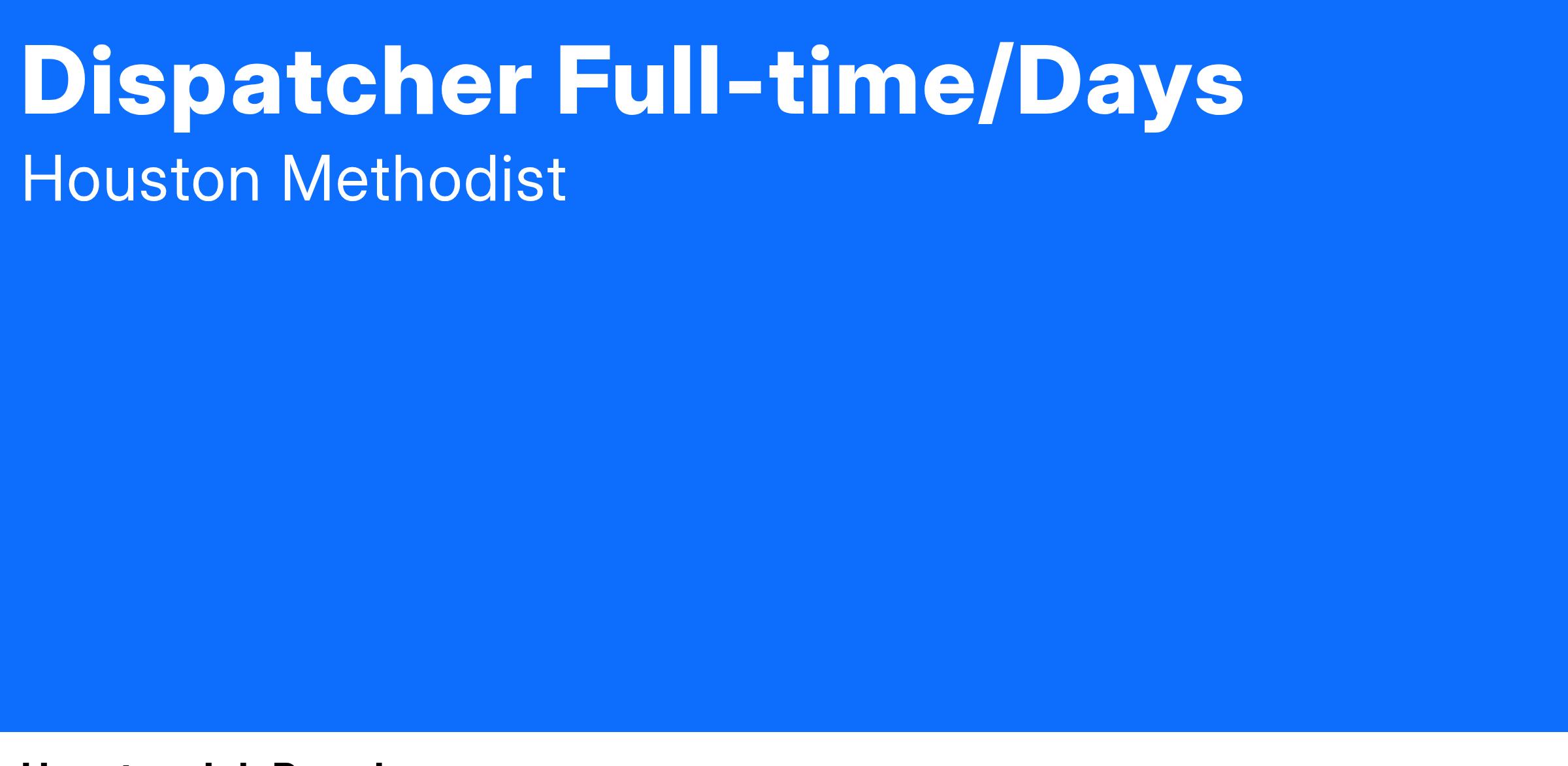 At Houston Methodist, the Dispatcher position is responsible for dispatching, tracking, and recording of maintenance requests assignments which include but not limited to: work orders, demand maintenance, preventive maintenance, painting, grounds keeping, and contractor services. This position may also be responsible for monitoring security access control, intrusion, video, communications, infant abduction, report management, and emergency management systems and coordinating and dispatching routine and emergency responses to security staff and additional departments as needed. The Dispatcher position serves as point person for customers in initiating and determining the status of work order and customer follow up review on completed work, proactively estimating work orders and assignments to allow adequate resource scheduling for each area. This position assists management in determining available resources and scheduling and provides support in screening and handling telephone calls and assist in routing departmental activities.