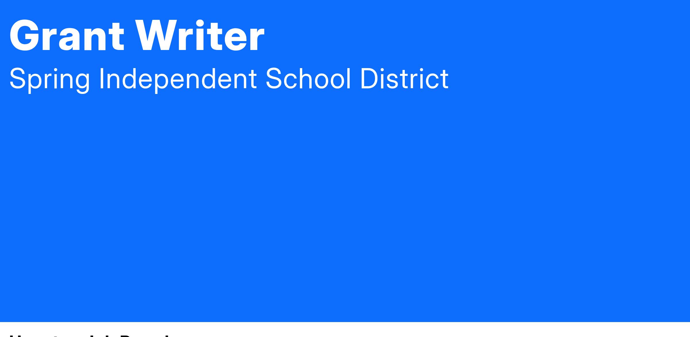 The Grant Writer will lead the district’s efforts in identifying, developing, writing, and securing grant funding opportunities that align with Spring ISD’s Five-Year Plan and strategic priorities. This position is responsible for managing all aspects of the grant development cycle including research, proposal writing, budgeting, compliance monitoring, and post-award reporting. The Grant Writer will also cultivate collaborative partnerships with internal and external stakeholders, community agencies, and public/private funding sources to expand educational opportunities and district capacity.
