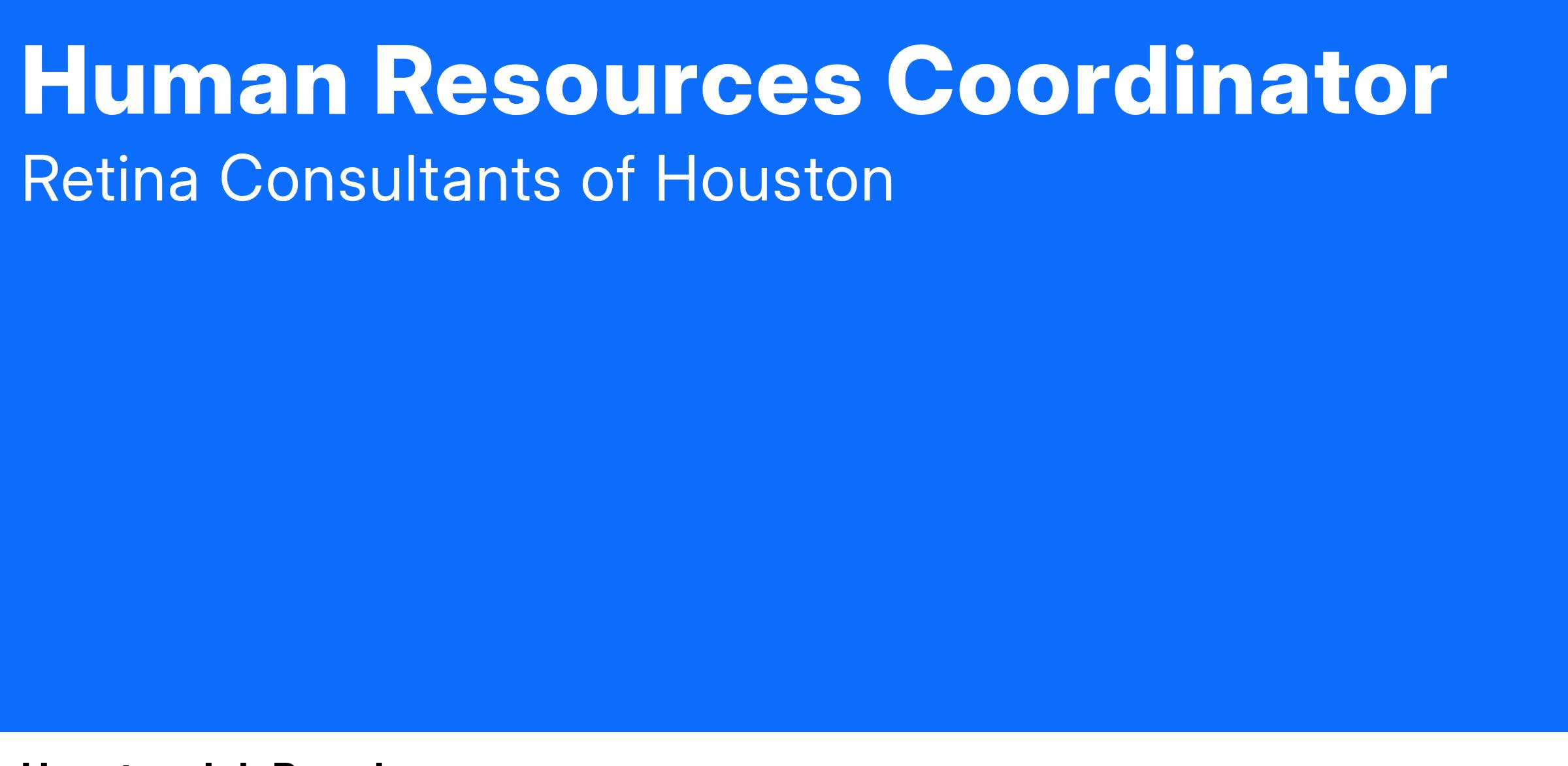 Retina Consultants of Texas (RCTX) is seeking a Human Resource Coordinator, who, under the general direction of the Director of Human Resources, assists in the administration of human resources function to include, but not limited to, recruitment and retention of staff, orientation, the company leave process, employee relations, policy administration, and coaching and training of people leaders. The Human Resources Coordinator assists with special HR projects and may serve as a project coordinator.