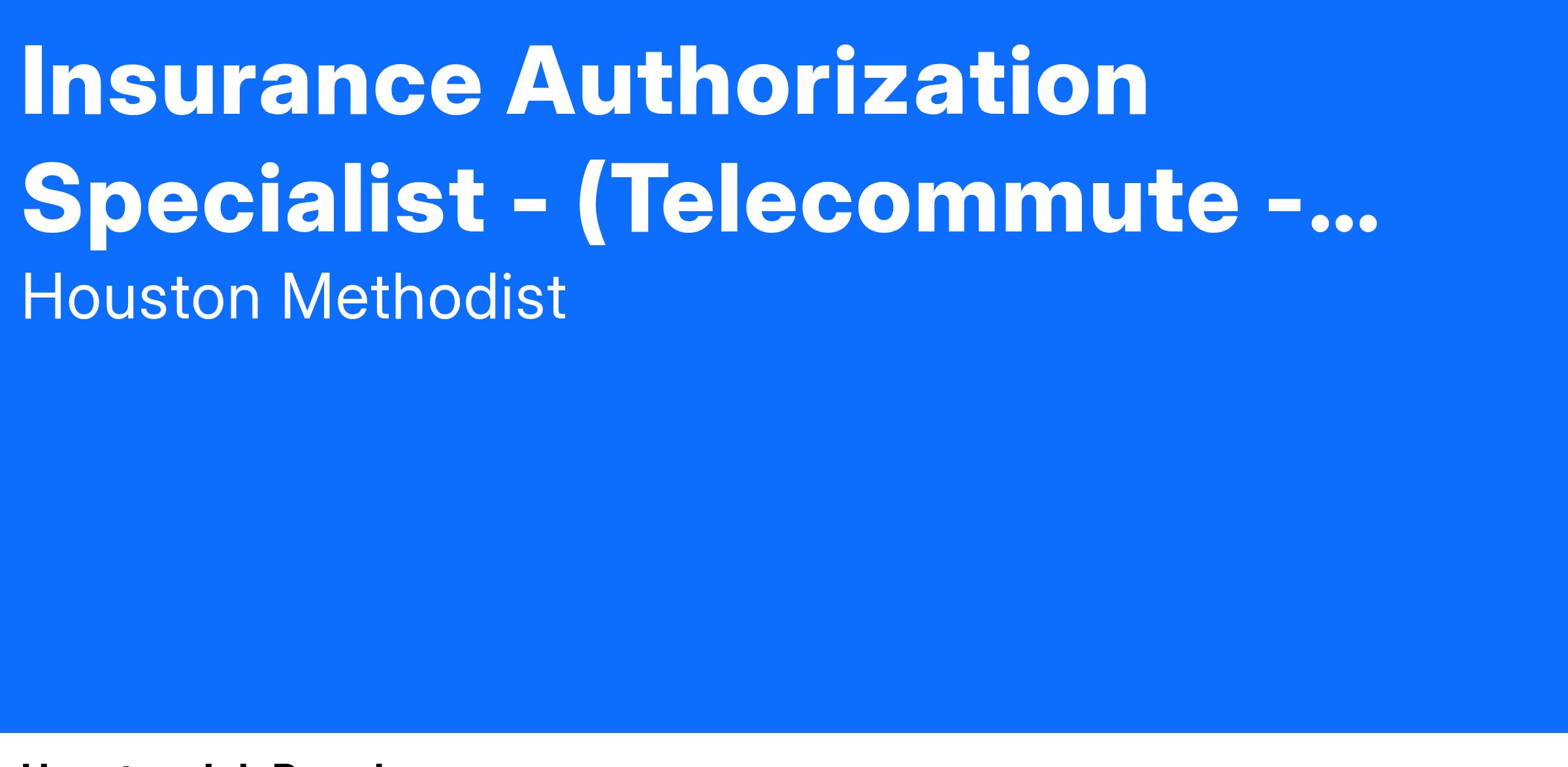 At Houston Methodist, the Insurance Authorization Specialist position is responsible for obtaining and managing insurance authorizations for medical services and simple procedures and treatments. Other duties may include obtaining insurance verification. This position will utilize effective communication skills in all interactions with patient's, co-workers, insurance companies, physicians, and other clinical and administrative partners.