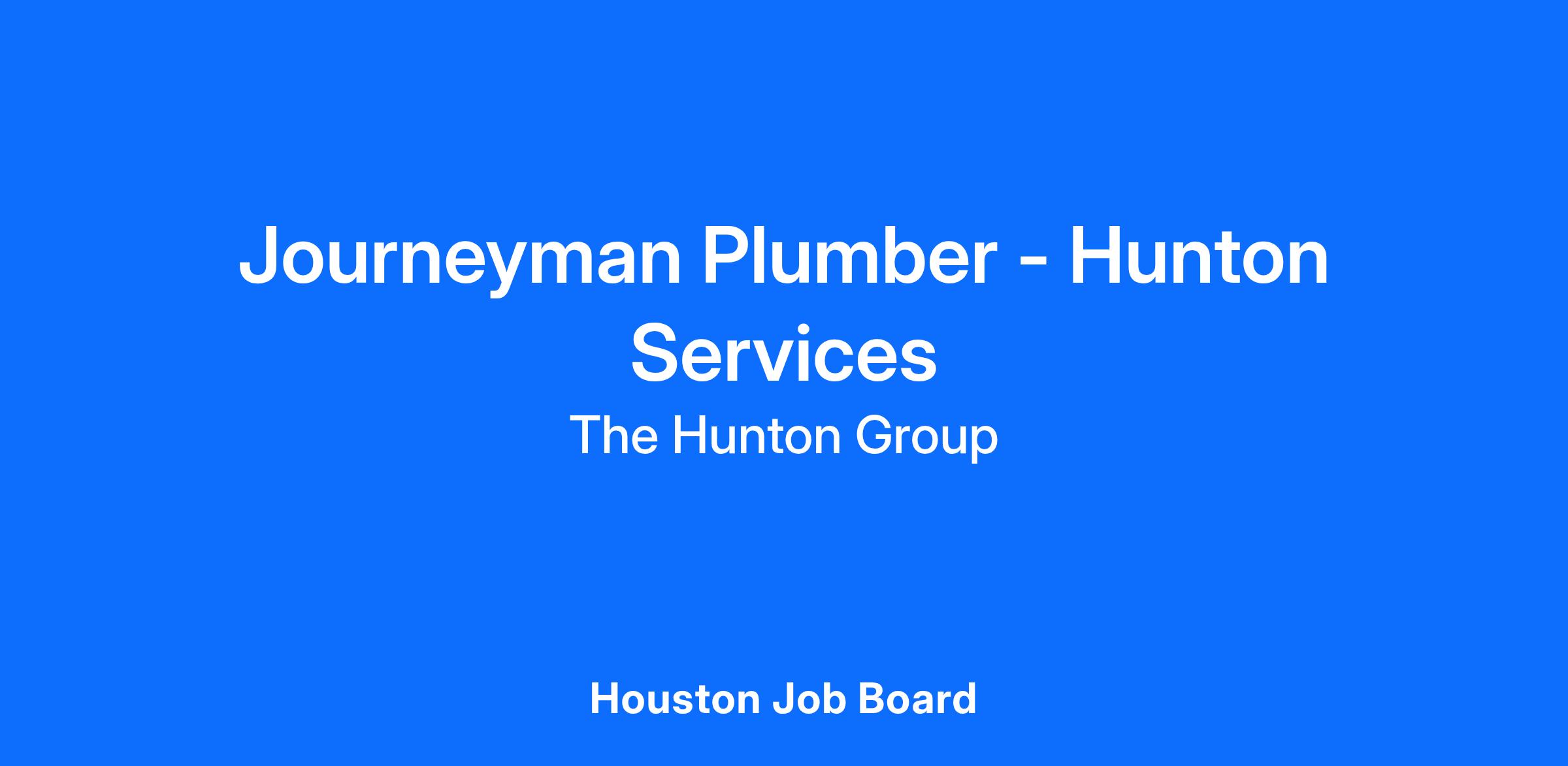 Hunton Services, a division of the Hunton Group in Houston, TX (www.huntongroup.com), is seeking to hire a Journeyman Plumber who will be responsible for performing diagnoses, repairs, maintenance and installations of medium sized, complex commercial plumbing systems and equipment. Selected candidate must have a Journeyman license in the state of Texas and be in good standing with the TSBPE.