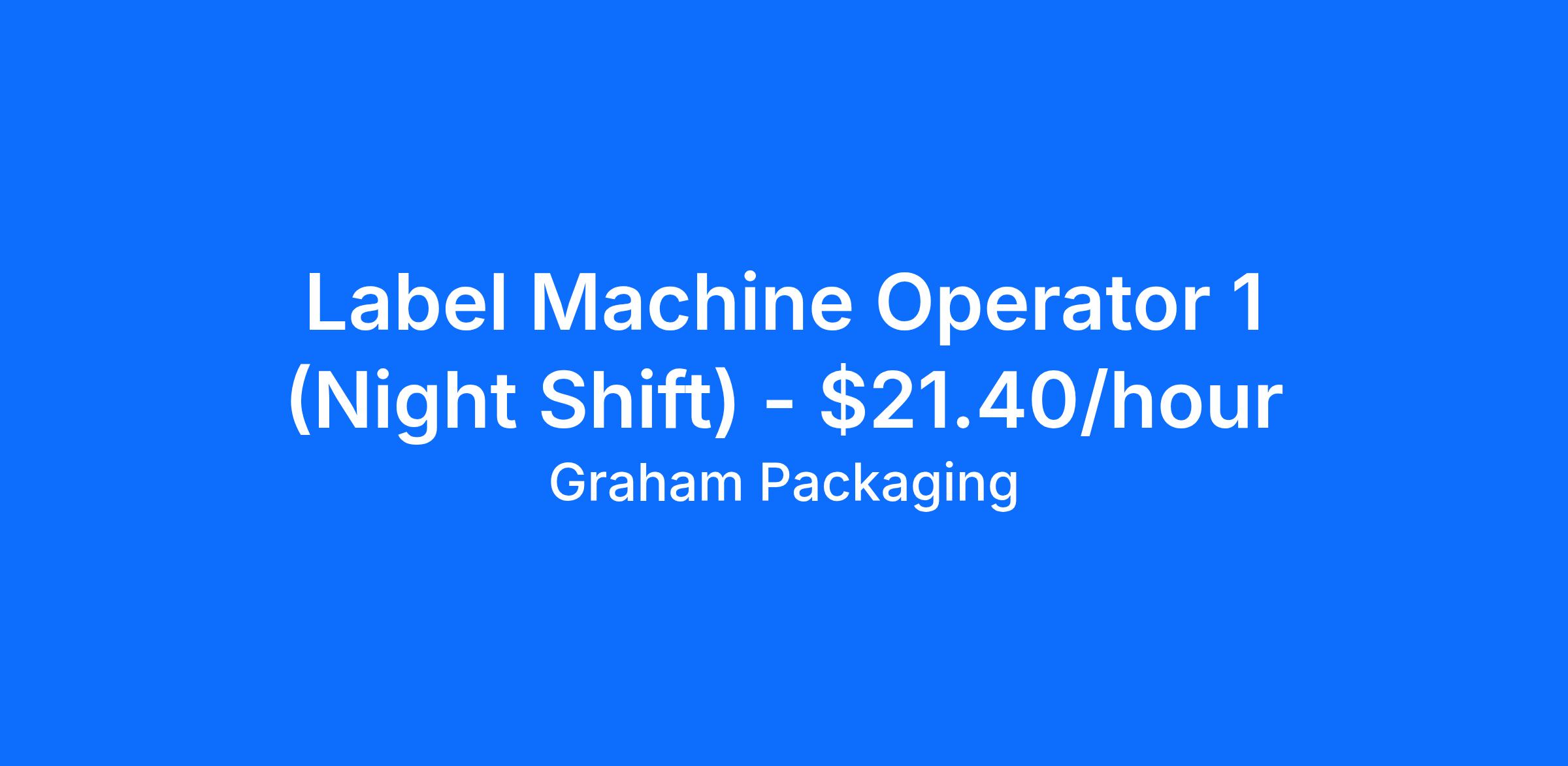 Graham Packaging Company is looking for a Label Machine Operator based in Houston, Texas. This opening is for NIGHT SHIFT, which operates during the hours of 6:00 PM - 6:30 AM. This position will operate downstream auxiliary equipment needed to produce plastic containers.
