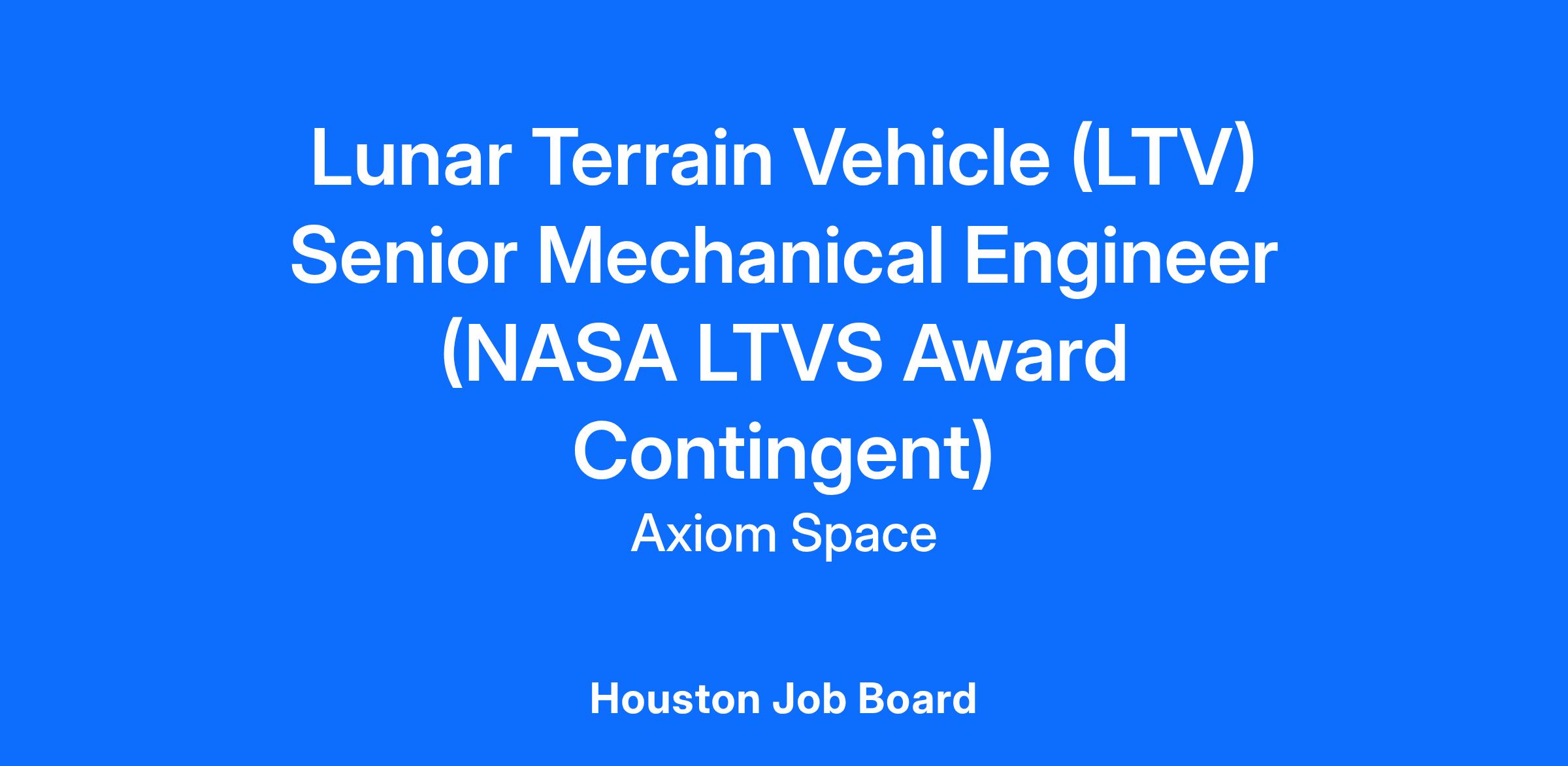 We are looking for a resilient, high-energy, experienced Senior Mechanical Engineer to join Axiom’s Lunar Terrain Vehicle (LTV) program in support of NASA’s LTV Services (LTVS) contract in partnership with Astrolab. The role requires strong problem solving, organizational, time management, and communication skills. Experience in Extravehicular Activities (EVA) and Extravehicular Robotics (EVR) operations and hardware is desired.
