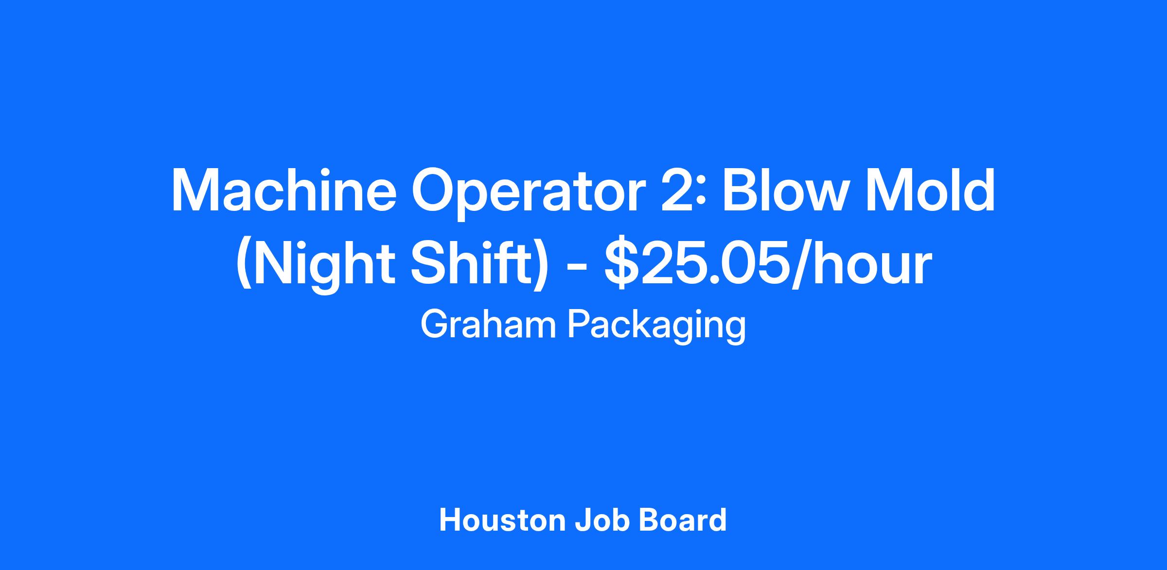 Graham Packaging Company is looking for a Blow Mold Machine Operator based in Houston, TX. This position is a night shift position working from 6:00 pm to 6:30 am.