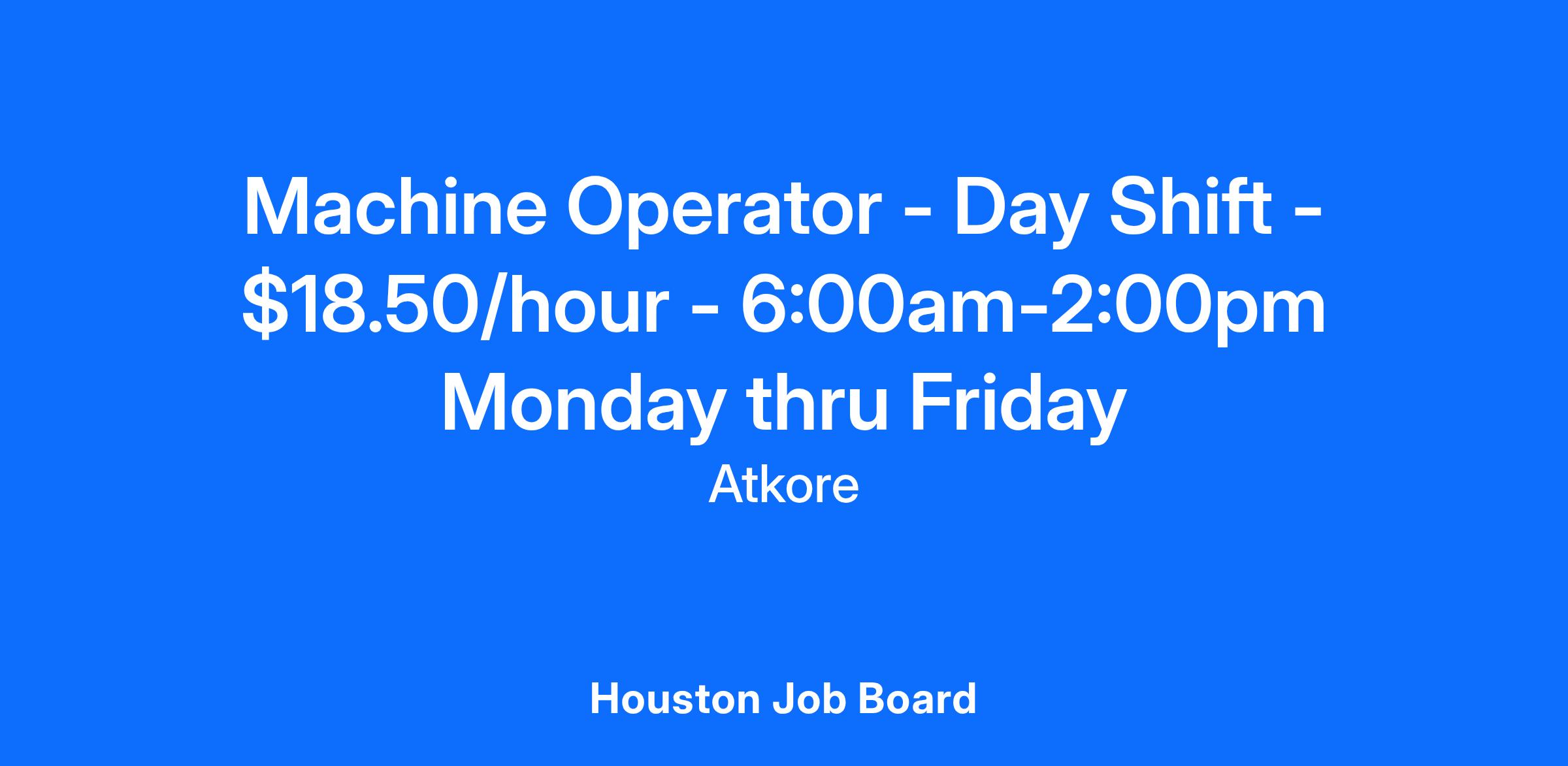 We are currently looking for a Machine Operator - Day Shift - $18.50/hour - 6:00am-2:00pm Monday thru Friday to be based out of Houston, TX. Reporting to the Supervisor, this person will be responsible for performing various tasks to set up, operate, monitor, and troubleshoot on assigned machines. The Machine Operator will also be responsible for inspecting parts to specifications and making adjustments or tool changes as necessary to maintain quality specifications. The Operator sets up and operates a production machine in accordance with established procedures and guidelines. Experience in lean manufacturing or business system-based company is a plus.