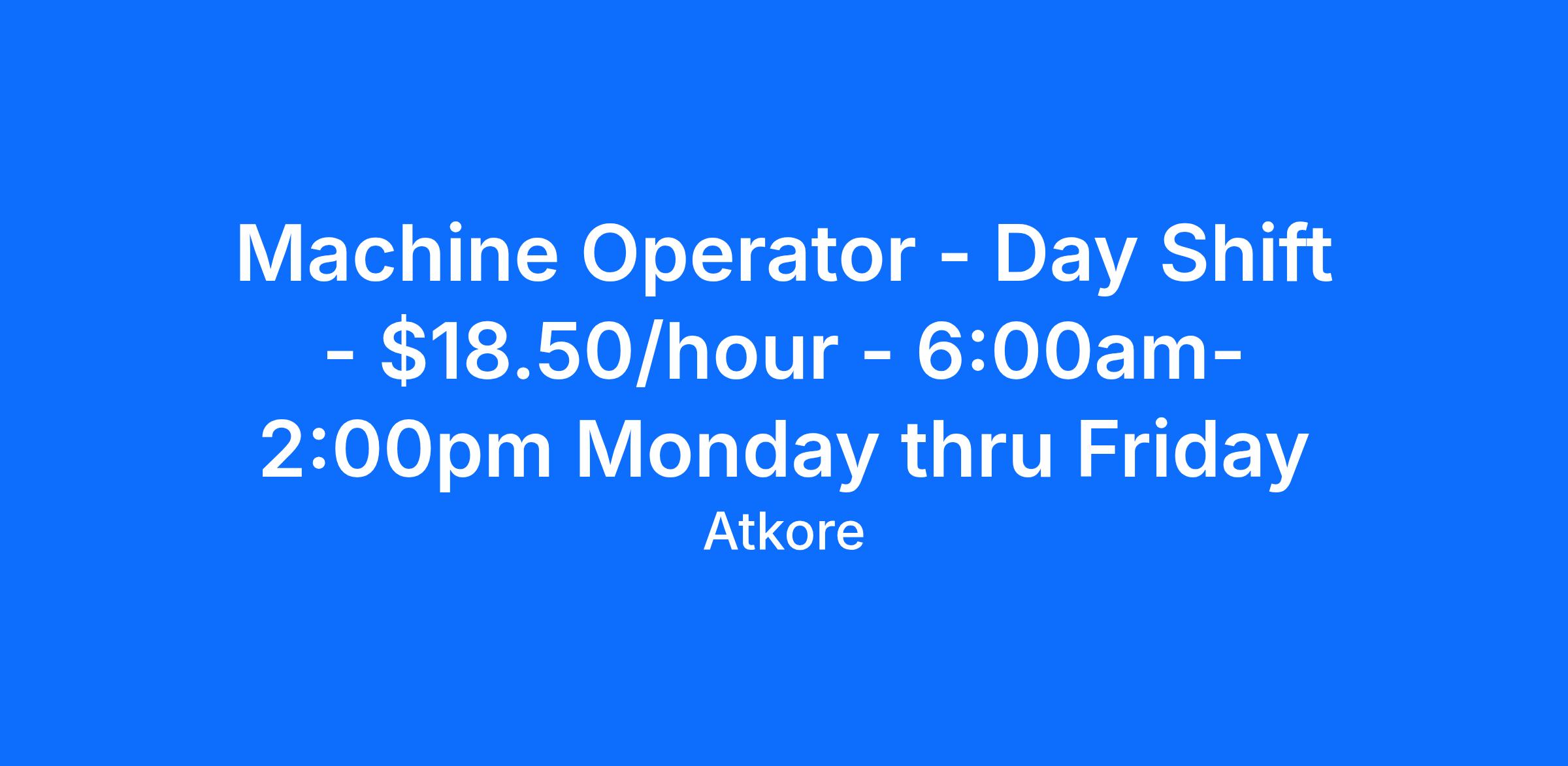 Machine Operator - Day Shift - $18.50/hour - 6:00am-2:00pm Monday thru Friday