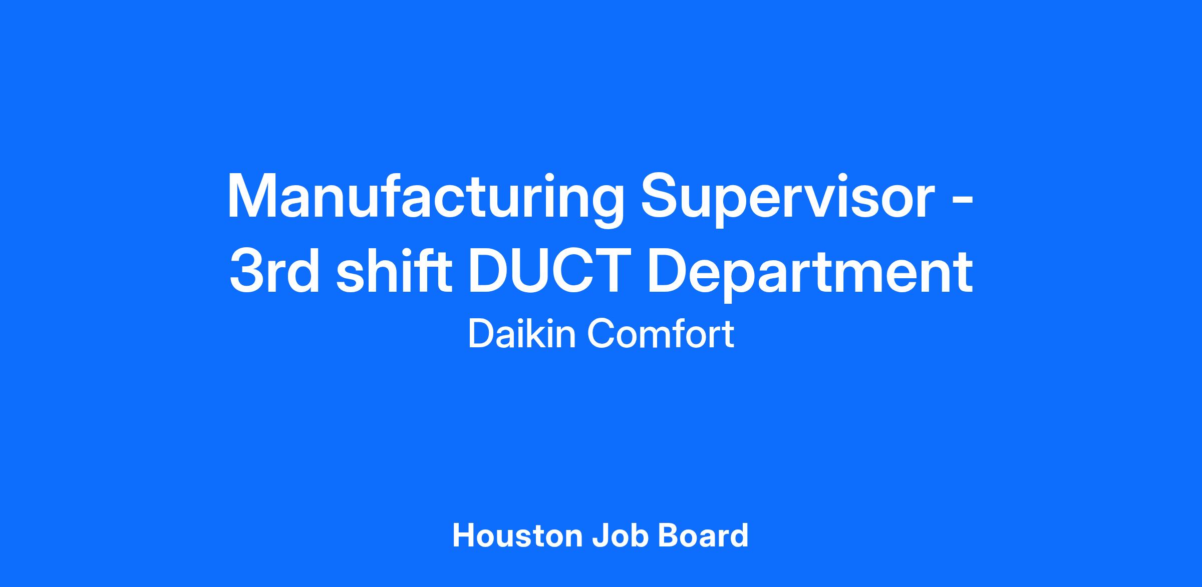 3rd shift Manufacturing Supervisor DUCT Department. Accomplishes manufacturing results by communicating job expectations; planning, monitoring, and appraising job results; coaching, counseling, and disciplining employees; and initiating, coordinating, and enforcing systems, policies, and procedures. Recruits, selects, onboards, trains, and mentors' employees.