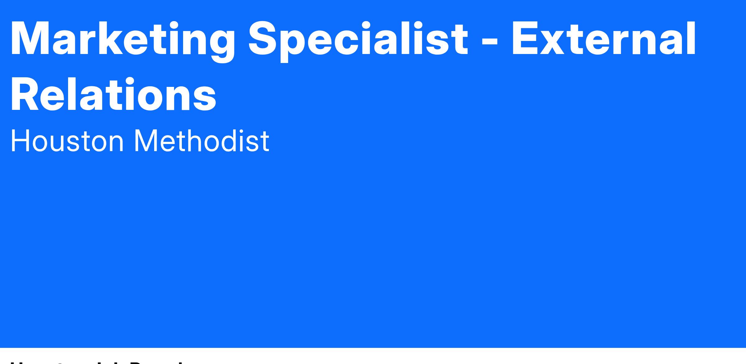 At Houston Methodist, the Marketing Specialist position is responsible for partnering with and supporting marketing management in driving preference and volume for assigned programs/service lines and maximizing the impact of assigned sponsorships. This client-facing role fosters positive relationships with hospital stakeholders, physicians and vendors as assigned and contributes to the development, implementation, measurement, and optimization of marketing/sponsorship plans. The Marketing Specialist contributes to developing effective business cases with management, digital, web, market research and other cross functional teams to drive positive change in partnership with hospital operations.