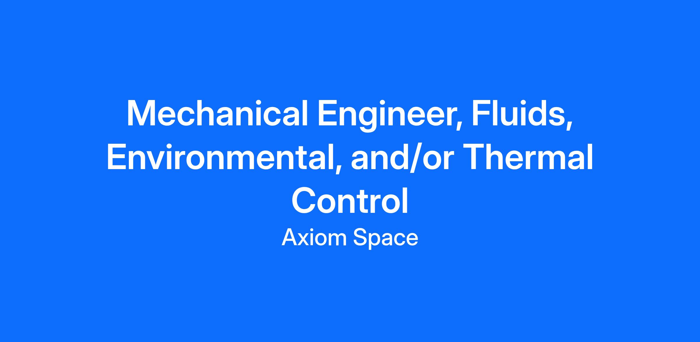 Axiom Space fosters a work environment inclusive of all perspectives. We are the pioneers of commercial space, leading the transformation of low-Earth orbit into a global space marketplace. Our mission-driven team is seeking a bold and dynamic Mechanical Engineer with Fluids, Environmental, and/or Thermal Control experience who is fueled by high ownership, execution horsepower, growth mindset, and driven to understand our world, science/technology, and life itself, for the benefit of all on Earth and beyond.