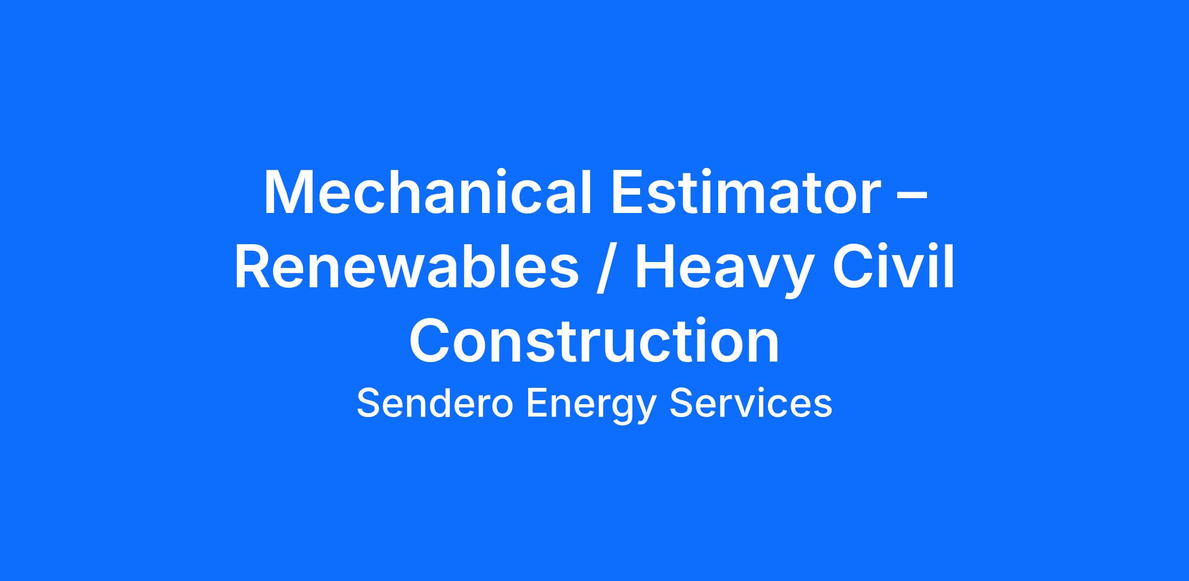Job Title: Mechanical Estimator – Renewables / Heavy Civil Construction Company: Sendero Energy Services Headquarters: Houston, TX Position Type: Full-Time About Sendero Energy Services: Sendero Energy Services is a leading civil construction-focused professional services firm, specializing in earthwork, drainage, and utility installations for renewable energy developers and EPC firms across the Southwest. We are passionate about advancing sustainable energy solutions by delivering best-in-class construction services with precision and integrity. Position Overview: As a Mechanical Estimator at Sendero Energy Services, you will be instrumental in expanding our capabilities into mechanical scopes for hydrogen, process piping, and electrical projects while continuing our focus on renewable energy. This role involves preparing accurate and competitive cost estimates, collaborating with cross-disciplinary teams, and helping us establish best practices in new sectors. A strong understanding of mechanical systems in industrial and renewable energy contexts is essential. Sendero Energy Services is located in Houston, Texas, however, assignments require travel to various locations in Texas, Arizona, or New Mexico. This successful candidate must be willing to travel and work from remote areas where our projects are located. Key Responsibilities 1. Estimation and Cost Analysis