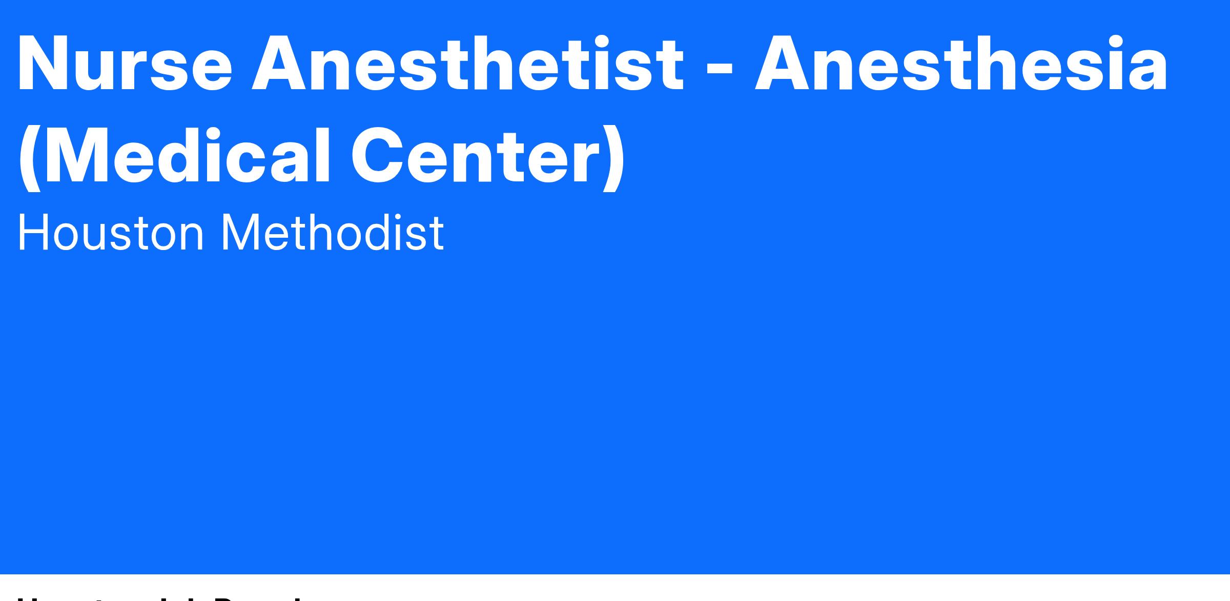 At Houston Methodist, the Nurse Anesthetist II position, under the direction of the attending Anesthesiologist and Chair of the Department, provides pre-anesthesia, anesthesia and post-anesthesia services in a clinical, research and academic environment. This position affects direct patient care according to the nurse practice act of the State of Texas and Houston Methodist Standards of Care policies and procedures. The Nurse Anesthetist position participates in the educational imperative of the Department of Anesthesiology.
