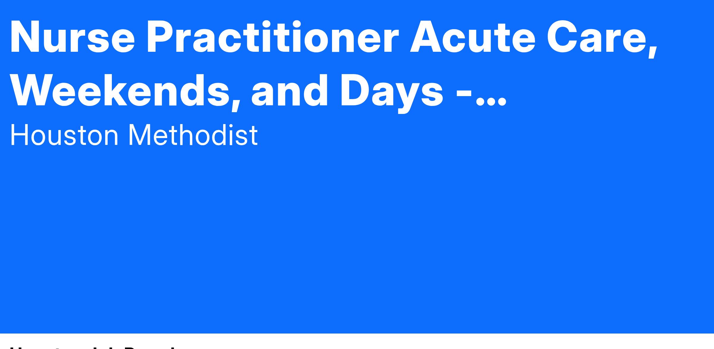 At Houston Methodist, the Nurse Practitioner Acute Care (NP-AC) is responsible for functioning as a licensed registered nurse and care provider to provide all aspects of patient care, including diagnosis, treatment and consultation while maintaining and promoting the health of the patient. This position may work in both inpatient and outpatient situations and performs according to the nurse practice act of the State of Texas and as part of a treatment team. The NP-AC position role models compassionate communication with patients, physicians and the interprofessional health care team and provides education to patients about preventative care and prescribed treatments. This position may also conduct physicals, order tests and serve as a patient's healthcare provider, prescribing medications as appropriate. The NP-AC position affects direct patient care according to the Houston Methodist Professional Practice Model Nursing Practice and Professional Performance policies and procedures.