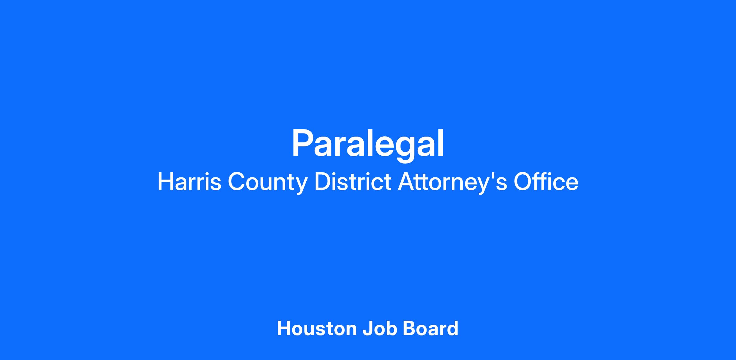 The Harris County District AttorneyοΏ½s Office is seeking qualified Paralegals to work directly with one or more Assistant District Attorneys. Responsibilities will vary depending on the specific assignment.