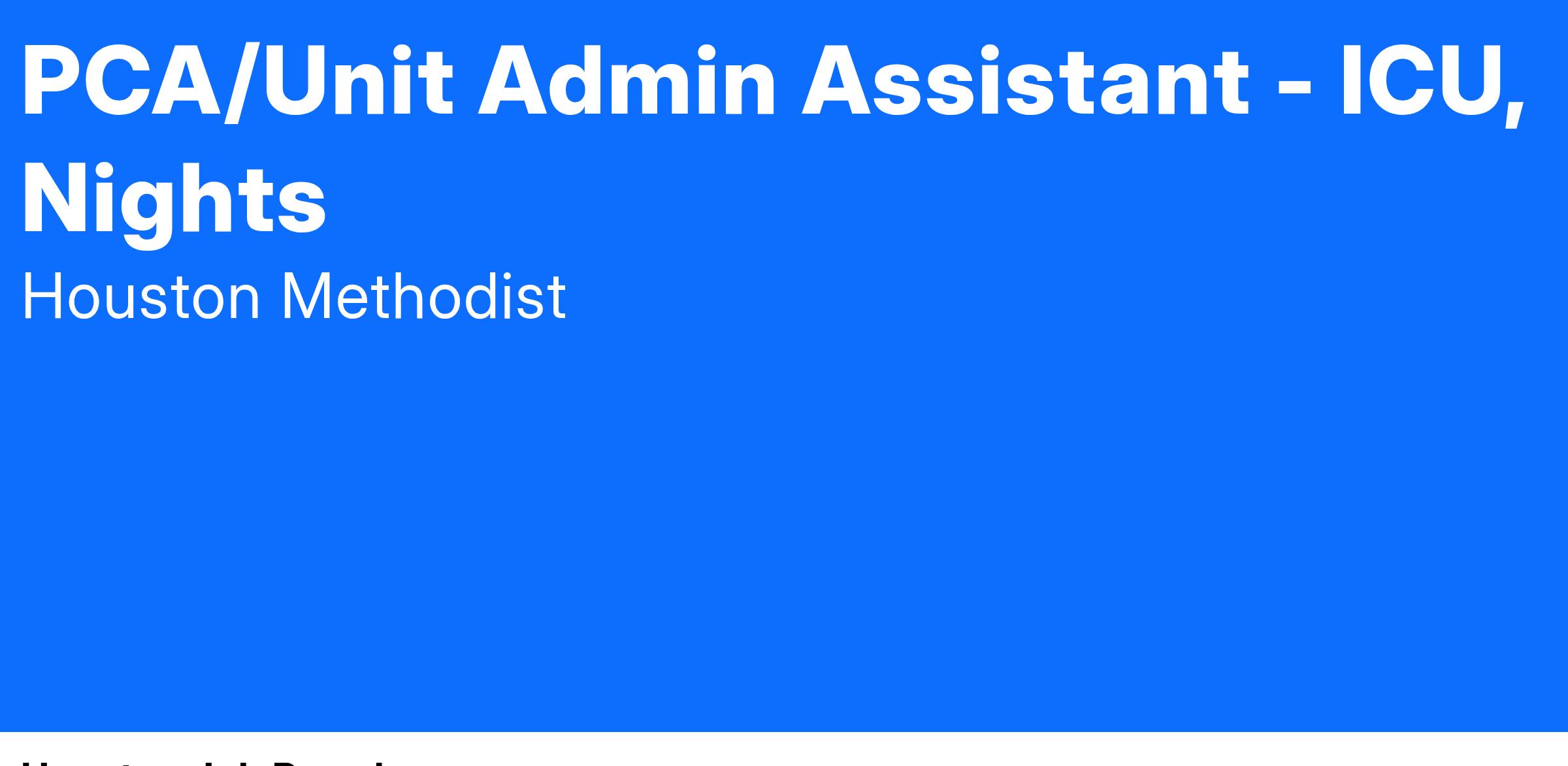 At Houston Methodist, the Patient Care Assistant/Unit Administrative Assistant (PCA/UAA) position is responsible for performing key functions that support the interprofessional team in delivering high quality, cost-effective care. The PCA/UAA position demonstrates basic knowledge and skills necessary to communicate appropriately and carry out delegated nursing assistant level tasks for assigned patient populations, assisting in the delivery of patient care and services under the supervision of a licensed nurse. This position performs basic patient care activities of daily living (ADL's) within unit-specific defined limits and job scope, such as assistance with patient elimination, hygiene, comfort, safety, nutrition, and progress activity and maintains competency requirements for computer medical terminology and other job-related functions, while practicing Patient and Family Centered Care in concert with Houston Methodist ICARE values: Integrity, Compassion, Accountability, Respect and Excellence. The PCA/UAA position assists with calls to physicians and their office, bed management, transfer services or other floors, coordinating with Operations Administrator as needed, answering incoming telephone calls for the unit and transfers as appropriate.