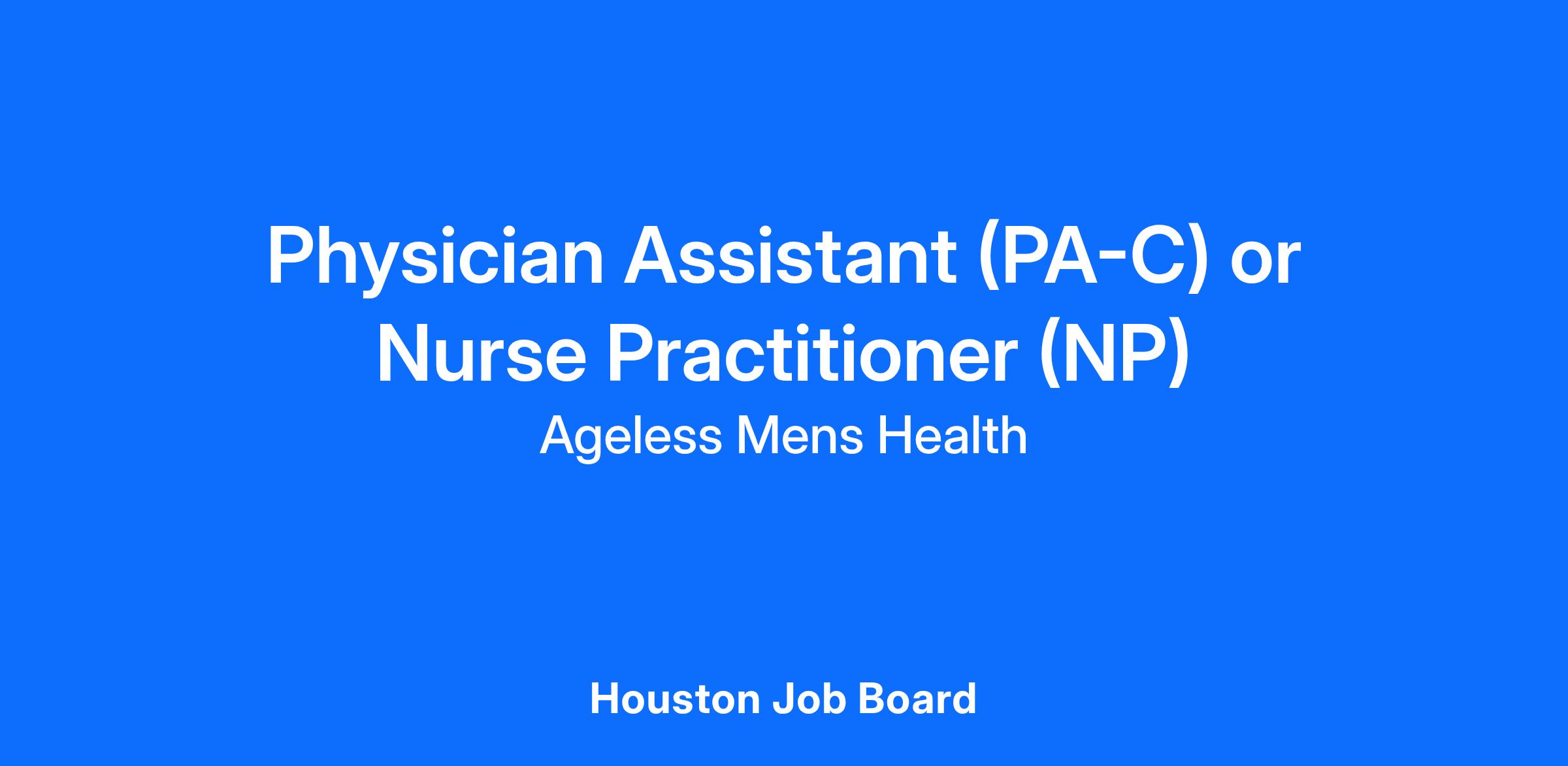With more than 90 clinics nationwide and a rapidly growing patient base, Ageless Men’s Health is seeking an experienced and compassionate Physician Assistant (PA-C) or Nurse Practitioner (NP) to join our clinical team in Houston and Sugarland.