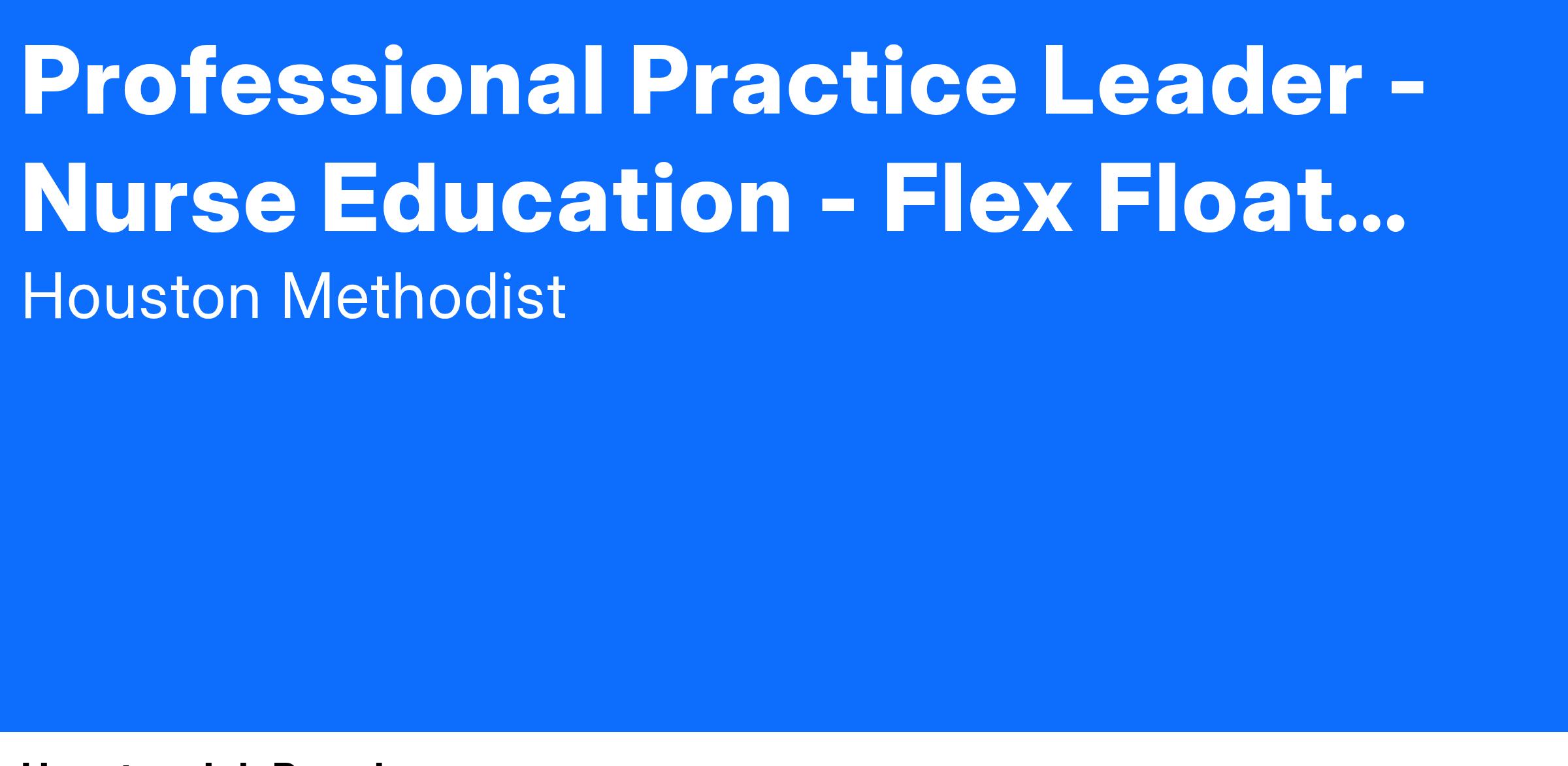 At Houston Methodist, the Professional Practice Leader position serves as a consultant and subject matter clinician for a service line/specialty area, functioning at the Expert level of Benner's model of clinical practice. The Professional Practice Leader position provides education and development to the direct patient care staff in addition to being accountable for the care outcomes of a service line or clinical population. This position leads and coordinates interprofessional activities focusing on clinical practice, consultation, education and research, incorporating evidence into practice. The Professional Practice Leader position uses expert communication skills to serve as care advocate and to mentor and coach staff in clinical and professional practice. This position assumes an advanced leadership role in analyzing systems to anticipate/reduce risk and improve patient safety/quality. Responsibilities for the Professional Practice Leader position include contributions at the unit and housewide levels, with expectation to collaborate/manage/lead on system-wide and national initiatives.