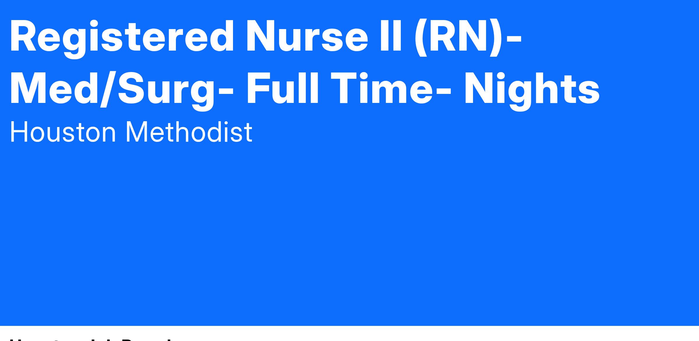 At Houston Methodist, the Registered Nurse (RN) II position is a licensed staff nurse, an experienced clinician, functions at the Competent to Proficient stage of Benner's model of clinical practice. The RN II position provides professional nursing care to a diverse patient population, conducts nursing assessments, assists with exams and treatment, patient education, and maintenance of medical records. The RN II position provides direct patient care effectively and efficiently which may include patients with varied and complex needs. This position communicates and collaborates with the physicians and interprofessional health care team to facilitate, coordinate and maintain compassionate, efficient, quality care and achievement of desired treatment outcomes. The RN II position demonstrates clinical competence when providing care, using technology, administering medications, performing procedures and managing emergencies, acting as a patient and family advocate in order to monitor and maintain patient rights. This position assumes leadership roles with progressive responsibility including but not limited to participating in or leading unit and shared governance initiatives, serving as charge nurse or preceptor to students or new employees, and possibly contributing to service line or hospital-wide initiatives in partnership with management.