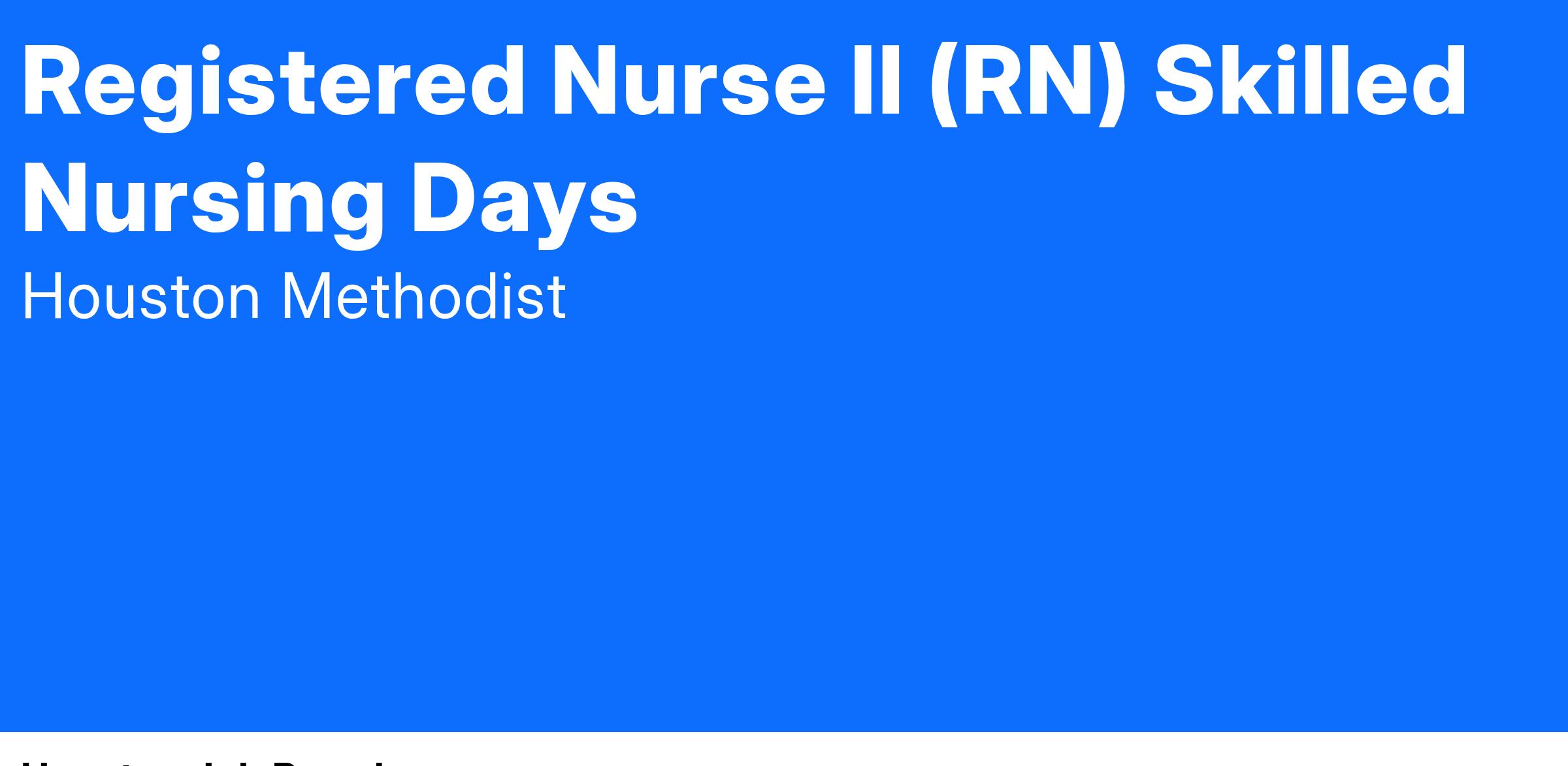 At Houston Methodist, the Registered Nurse (RN) II position a licensed staff nurse, an experienced clinician, functions at the Competent to Proficient stage of Benner's model of clinical practice. The RN II position is responsible for providing professional nursing care to a diverse patient population, conducting nursing assessments, assisting with exams and treatment, patient education, and maintenance of medical records. The RN II position provides direct patient care effectively and efficiently which may include patients with varied and complex needs. This position communicates and collaborates with the physicians and interprofessional health care team to facilitate, coordinate, and maintain compassionate, efficient, quality care and achievement of desired treatment outcomes. The RN II position demonstrates clinical competence when providing care, using technology, administering medications, performing procedures, and managing emergencies, acting as a patient and family advocate in order to monitor and maintain patient rights. This position assumes leadership roles with progressive responsibility including but not limited to participating in or leading unit and shared governance initiatives, serving as charge nurse or preceptor to students or new employees, and possibly contributing to service line or hospital-wide initiatives in partnership with management.