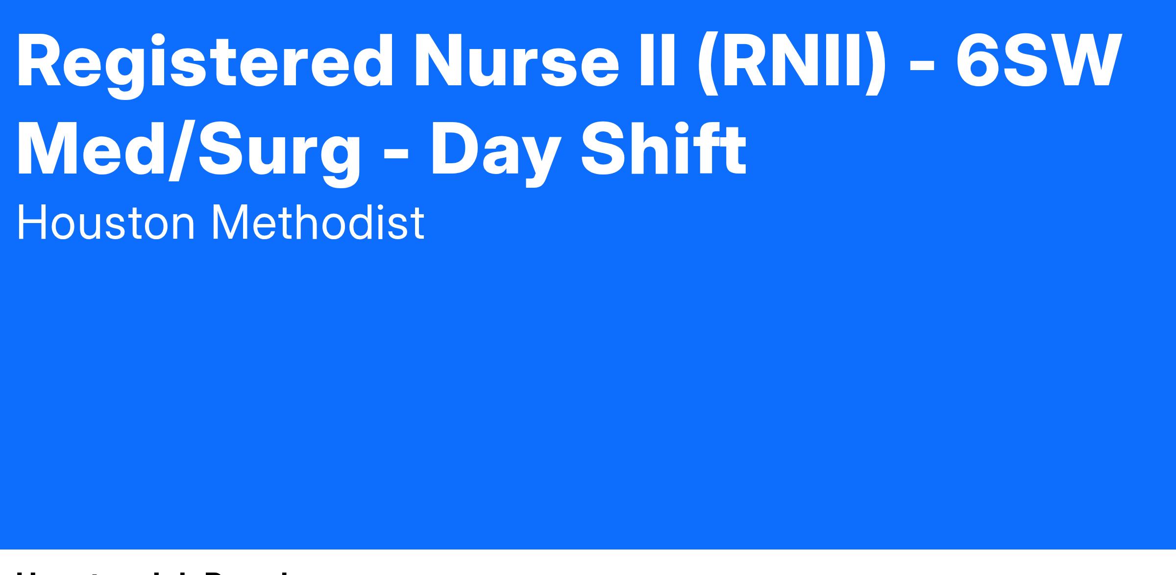 At Houston Methodist, the Registered Nurse (RN) II position a licensed staff nurse, an experienced clinician, functions at the Competent to Proficient stage of Benner's model of clinical practice. The RN II position is responsible for providing professional nursing care to a diverse patient population, conducting nursing assessments, assisting with exams and treatment, patient education, and maintenance of medical records. The RN II position provides direct patient care effectively and efficiently which may include patients with varied and complex needs. This position communicates and collaborates with the physicians and interprofessional health care team to facilitate, coordinate, and maintain compassionate, efficient, quality care and achievement of desired treatment outcomes. The RN II position demonstrates clinical competence when providing care, using technology, administering medications, performing procedures, and managing emergencies, acting as a patient and family advocate in order to monitor and maintain patient rights. This position assumes leadership roles with progressive responsibility including but not limited to participating in or leading unit and shared governance initiatives, serving as charge nurse or preceptor to students or new employees, and possibly contributing to service line or hospital-wide initiatives in partnership with management.