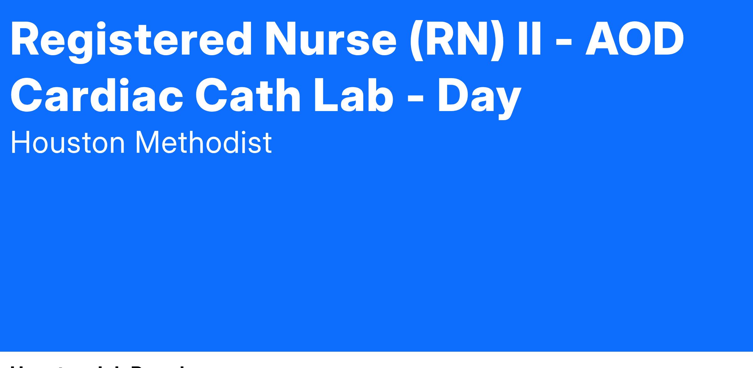 At Houston Methodist, the Registered Nurse (RN) II position is a licensed staff nurse, an experienced clinician, functions at the Competent to Proficient stage of Benner's model of clinical practice. The RN II position provides professional nursing care to a diverse patient population, conducts nursing assessments, assists with exams and treatment, patient education, and maintenance of medical records. The RN II position provides direct patient care effectively and efficiently which may include patients with varied and complex needs. This position communicates and collaborates with the physicians and interprofessional health care team to facilitate, coordinate and maintain compassionate, efficient, quality care and achievement of desired treatment outcomes. The RN II position demonstrates clinical competence when providing care, using technology, administering medications, performing procedures and managing emergencies, acting as a patient and family advocate in order to monitor and maintain patient rights. This position assumes leadership roles with progressive responsibility including but not limited to participating in or leading unit and shared governance initiatives, serving as charge nurse or preceptor to students or new employees, and possibly contributing to service line or hospital-wide initiatives in partnership with management.
