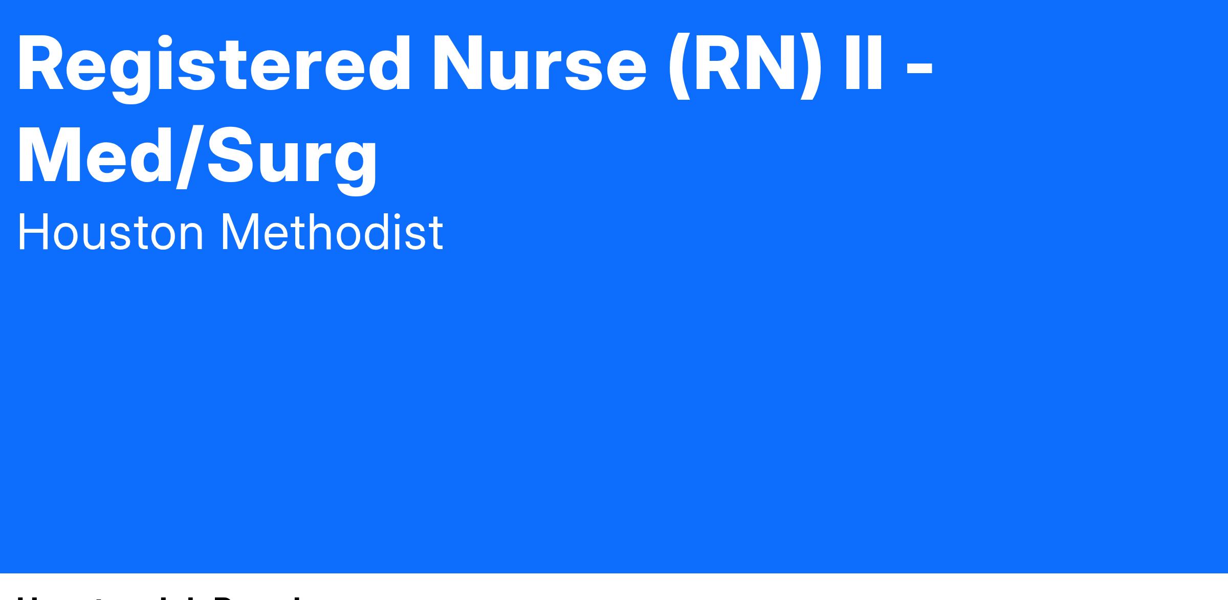 At Houston Methodist, the Registered Nurse (RN) II position is a licensed staff nurse, an experienced clinician, functions at the Competent to Proficient stage of Benner's model of clinical practice. The RN II position provides professional nursing care to a diverse patient population, conducts nursing assessments, assists with exams and treatment, patient education, and maintenance of medical records. The RN II position provides direct patient care effectively and efficiently which may include patients with varied and complex needs. This position communicates and collaborates with the physicians and interprofessional health care team to facilitate, coordinate and maintain compassionate, efficient, quality care and achievement of desired treatment outcomes. The RN II position demonstrates clinical competence when providing care, using technology, administering medications, performing procedures and managing emergencies, acting as a patient and family advocate in order to monitor and maintain patient rights. This position assumes leadership roles with progressive responsibility including but not limited to participating in or leading unit and shared governance initiatives, serving as charge nurse or preceptor to students or new employees, and possibly contributing to service line or hospital-wide initiatives in partnership with management.