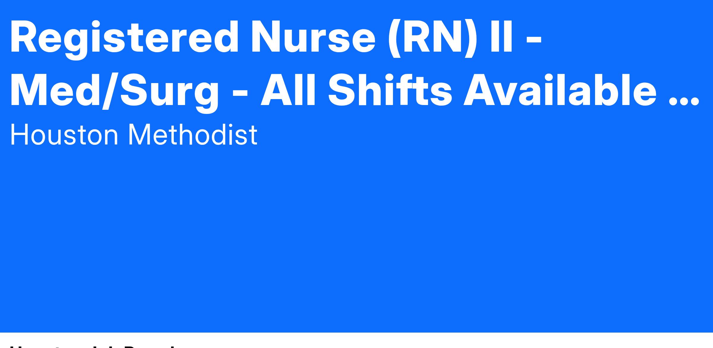 At Houston Methodist, the Registered Nurse (RN) II position is a licensed staff nurse, an experienced clinician, functions at the Competent to Proficient stage of Benner's model of clinical practice. The RN II position provides professional nursing care to a diverse patient population, conducts nursing assessments, assists with exams and treatment, patient education, and maintenance of medical records. The RN II position provides direct patient care effectively and efficiently which may include patients with varied and complex needs. This position communicates and collaborates with the physicians and interprofessional health care team to facilitate, coordinate and maintain compassionate, efficient, quality care and achievement of desired treatment outcomes. The RN II position demonstrates clinical competence when providing care, using technology, administering medications, performing procedures and managing emergencies, acting as a patient and family advocate in order to monitor and maintain patient rights. This position assumes leadership roles with progressive responsibility including but not limited to participating in or leading unit and shared governance initiatives, serving as charge nurse or preceptor to students or new employees, and possibly contributing to service line or hospital-wide initiatives in partnership with management.