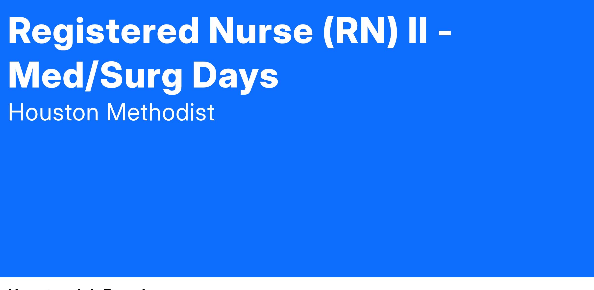 At Houston Methodist, the Registered Nurse (RN) II position a licensed staff nurse, an experienced clinician, functions at the Competent to Proficient stage of Benner's model of clinical practice. The RN II position is responsible for providing professional nursing care to a diverse patient population, conducting nursing assessments, assisting with exams and treatment, patient education, and maintenance of medical records. The RN II position provides direct patient care effectively and efficiently which may include patients with varied and complex needs. This position communicates and collaborates with the physicians and interprofessional health care team to facilitate, coordinate, and maintain compassionate, efficient, quality care and achievement of desired treatment outcomes. The RN II position demonstrates clinical competence when providing care, using technology, administering medications, performing procedures, and managing emergencies, acting as a patient and family advocate in order to monitor and maintain patient rights. This position assumes leadership roles with progressive responsibility including but not limited to participating in or leading unit and shared governance initiatives, serving as charge nurse or preceptor to students or new employees, and possibly contributing to service line or hospital-wide initiatives in partnership with management.
