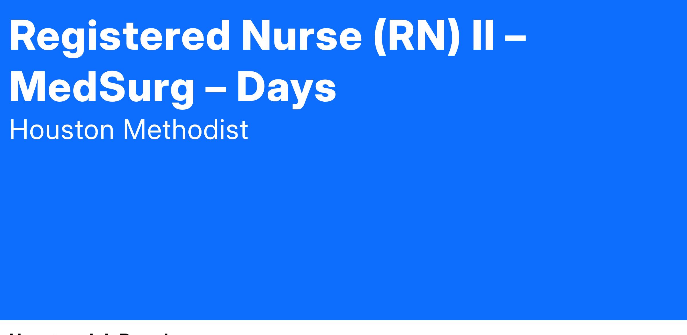 At Houston Methodist, the Registered Nurse (RN) II position a licensed staff nurse, an experienced clinician, functions at the Competent to Proficient stage of Benner's model of clinical practice. The RN II position is responsible for providing professional nursing care to a diverse patient population, conducting nursing assessments, assisting with exams and treatment, patient education, and maintenance of medical records. The RN II position provides direct patient care effectively and efficiently which may include patients with varied and complex needs. This position communicates and collaborates with the physicians and interprofessional health care team to facilitate, coordinate, and maintain compassionate, efficient, quality care and achievement of desired treatment outcomes. The RN II position demonstrates clinical competence when providing care, using technology, administering medications, performing procedures, and managing emergencies, acting as a patient and family advocate in order to monitor and maintain patient rights. This position assumes leadership roles with progressive responsibility including but not limited to participating in or leading unit and shared governance initiatives, serving as charge nurse or preceptor to students or new employees, and possibly contributing to service line or hospital-wide initiatives in partnership with management.