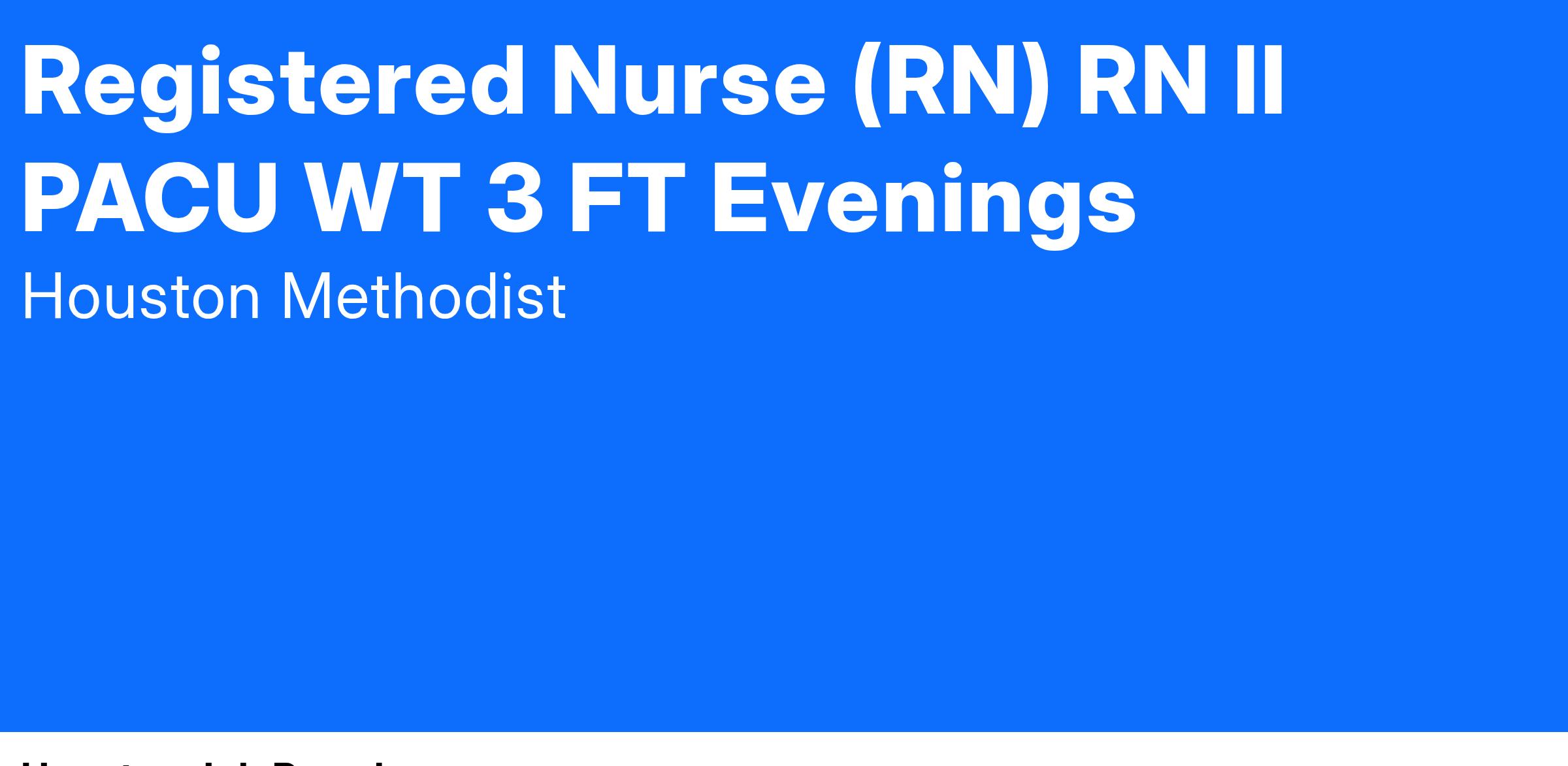 At Houston Methodist, the Registered Nurse (RN) II position a licensed staff nurse, an experienced clinician, functions at the Competent to Proficient stage of Benner's model of clinical practice. The RN II position is responsible for providing professional nursing care to a diverse patient population, conducting nursing assessments, assisting with exams and treatment, patient education, and maintenance of medical records. The RN II position provides direct patient care effectively and efficiently which may include patients with varied and complex needs. This position communicates and collaborates with the physicians and interprofessional health care team to facilitate, coordinate, and maintain compassionate, efficient, quality care and achievement of desired treatment outcomes. The RN II position demonstrates clinical competence when providing care, using technology, administering medications, performing procedures, and managing emergencies, acting as a patient and family advocate in order to monitor and maintain patient rights. This position assumes leadership roles with progressive responsibility including but not limited to participating in or leading unit and shared governance initiatives, serving as charge nurse or preceptor to students or new employees, and possibly contributing to service line or hospital-wide initiatives in partnership with management.