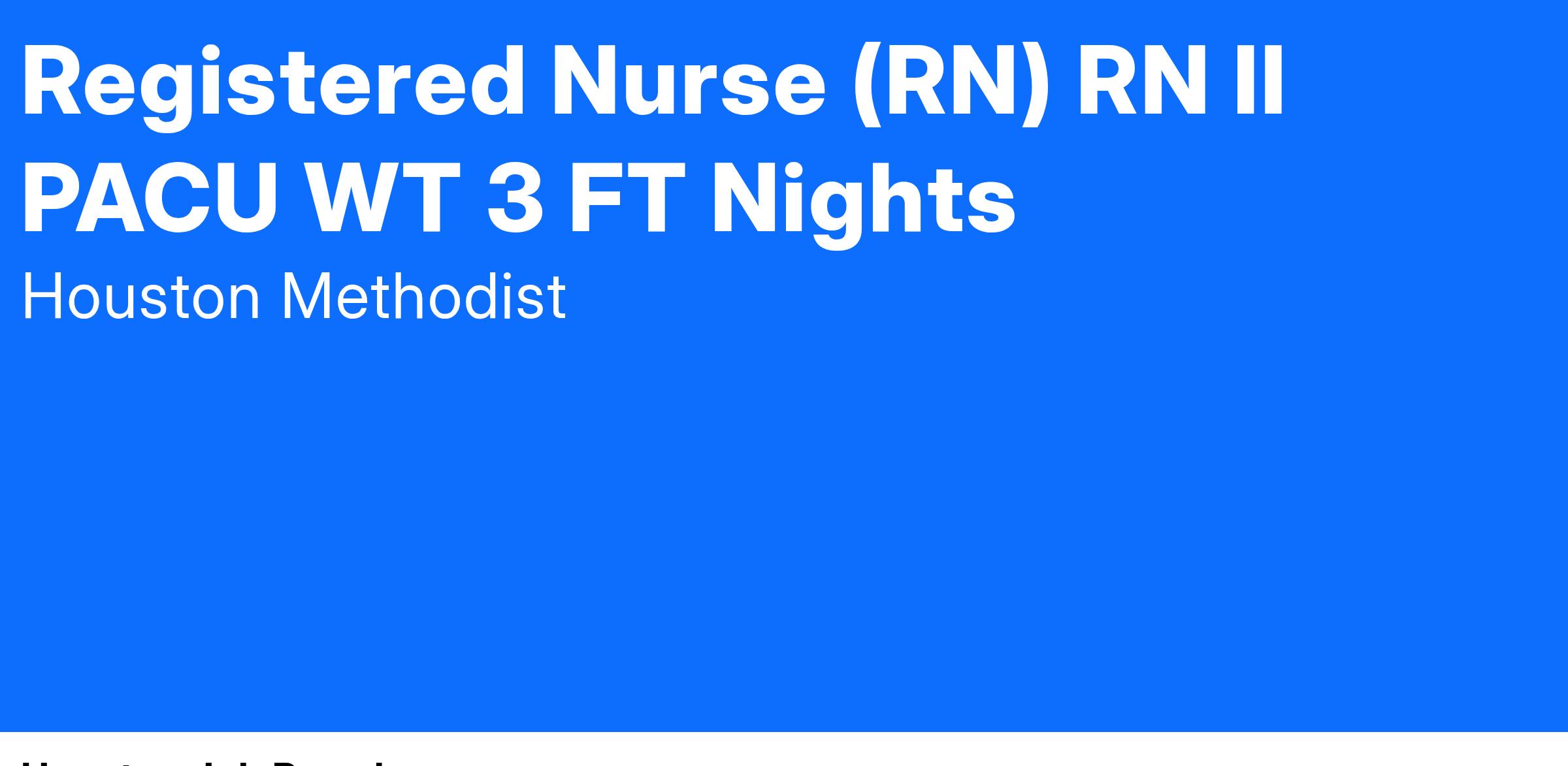At Houston Methodist, the Registered Nurse (RN) II position a licensed staff nurse, an experienced clinician, functions at the Competent to Proficient stage of Benner's model of clinical practice. The RN II position is responsible for providing professional nursing care to a diverse patient population, conducting nursing assessments, assisting with exams and treatment, patient education, and maintenance of medical records. The RN II position provides direct patient care effectively and efficiently which may include patients with varied and complex needs. This position communicates and collaborates with the physicians and interprofessional health care team to facilitate, coordinate, and maintain compassionate, efficient, quality care and achievement of desired treatment outcomes. The RN II position demonstrates clinical competence when providing care, using technology, administering medications, performing procedures, and managing emergencies, acting as a patient and family advocate in order to monitor and maintain patient rights. This position assumes leadership roles with progressive responsibility including but not limited to participating in or leading unit and shared governance initiatives, serving as charge nurse or preceptor to students or new employees, and possibly contributing to service line or hospital-wide initiatives in partnership with management.