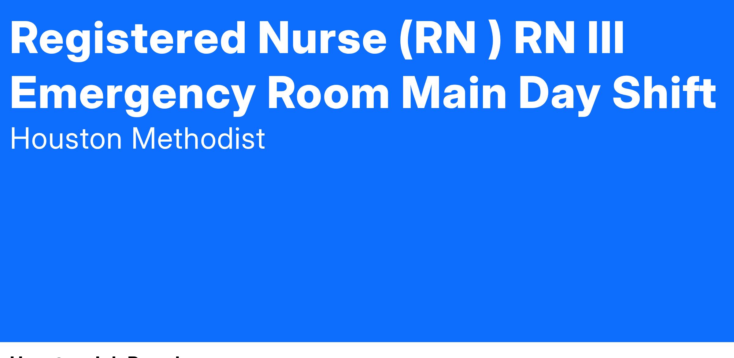 At Houston Methodist, the Registered Nurse (RN) III position a licensed staff nurse, who as an advanced clinician, functions at the Proficient level according to Benner's model of clinical practice. The RN III position provides professional direct patient nursing care to a diverse patient population and is considered an expert in a specialty. Besides conducting nursing assessments, assisting with exams and treatment and maintenance of medical records, this position assists in coaching and mentoring department staff in areas of clinical and professional practice. Role modeling compassionate communication with physicians and the interprofessional health care team, the RN III position assumes leadership responsibilities with high level contributions at the bedside, unit, service line, and across the institution. Responsibilities for this position may include but are not limited to leading unit and shared governance activities, serving as charge nurse as needed, assessing unit needs related to practice and improvement opportunities, serving as a clinical resource for both unit and hospital staff and coordinating unit and hospital-wide education in partnership with management.