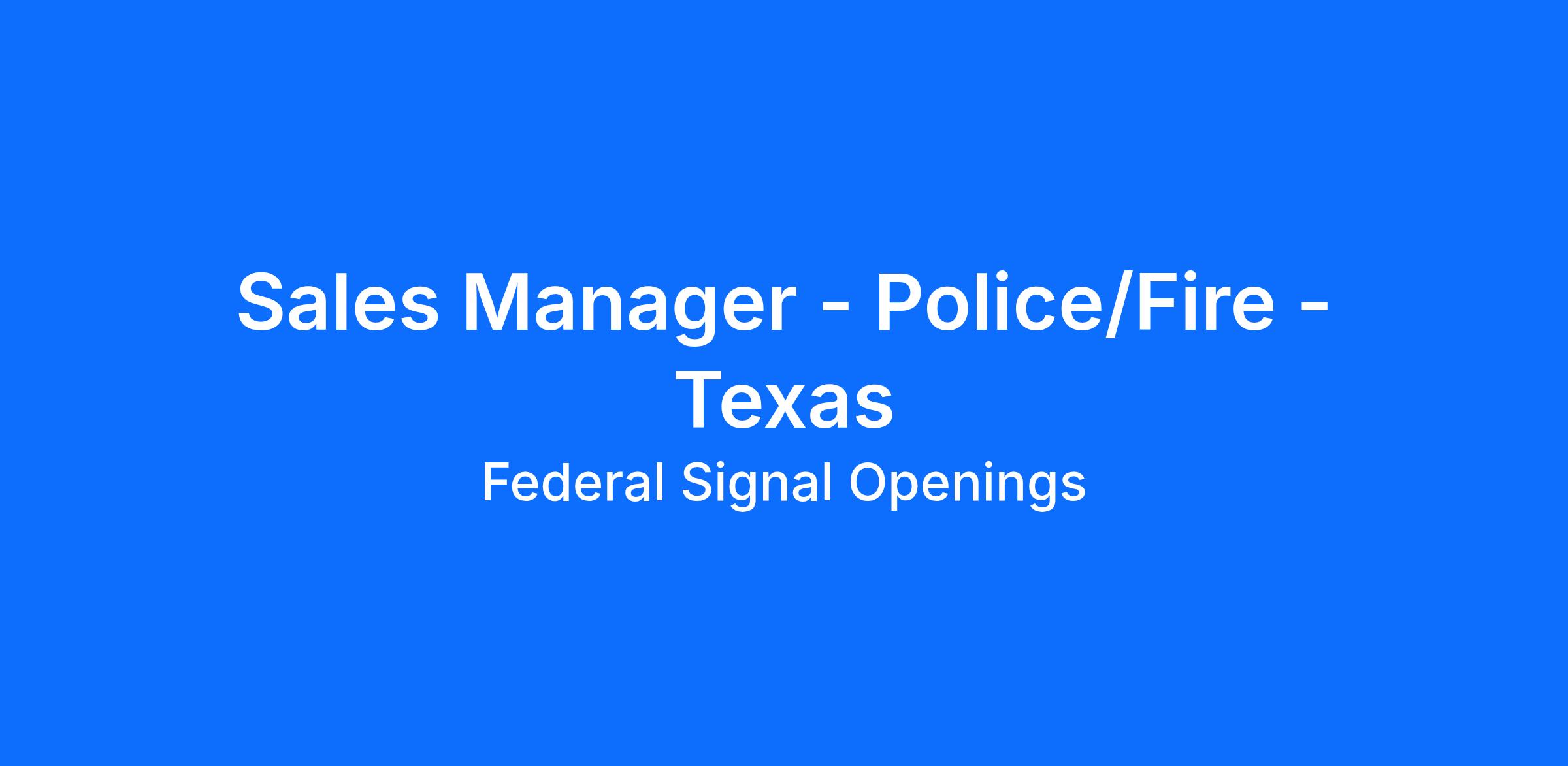 Federal Signal has an immediate opening for a Sales Manager to promote our Police / Fire market vehicle products. The territory will include Texas with ideal candidate residing in the Houston area.