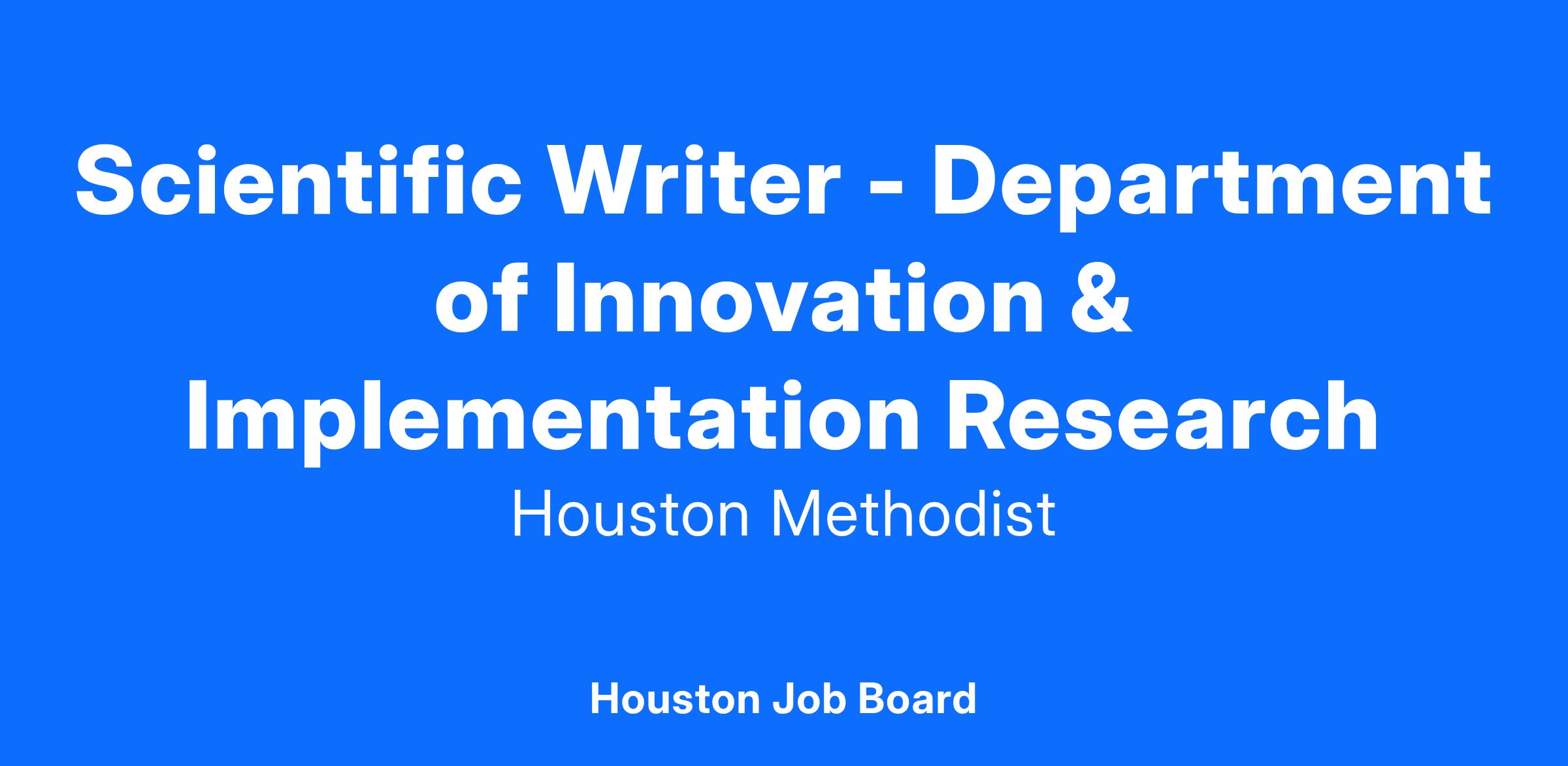The Scientific Writer at Houston Methodist, Department of Digital Health Innovation and Implementation Research position must have experience writing and editing a variety of digital health/innovation topics in multiple health care settings and in different specialties focusing on impact ranging from clinical to operational and financial.