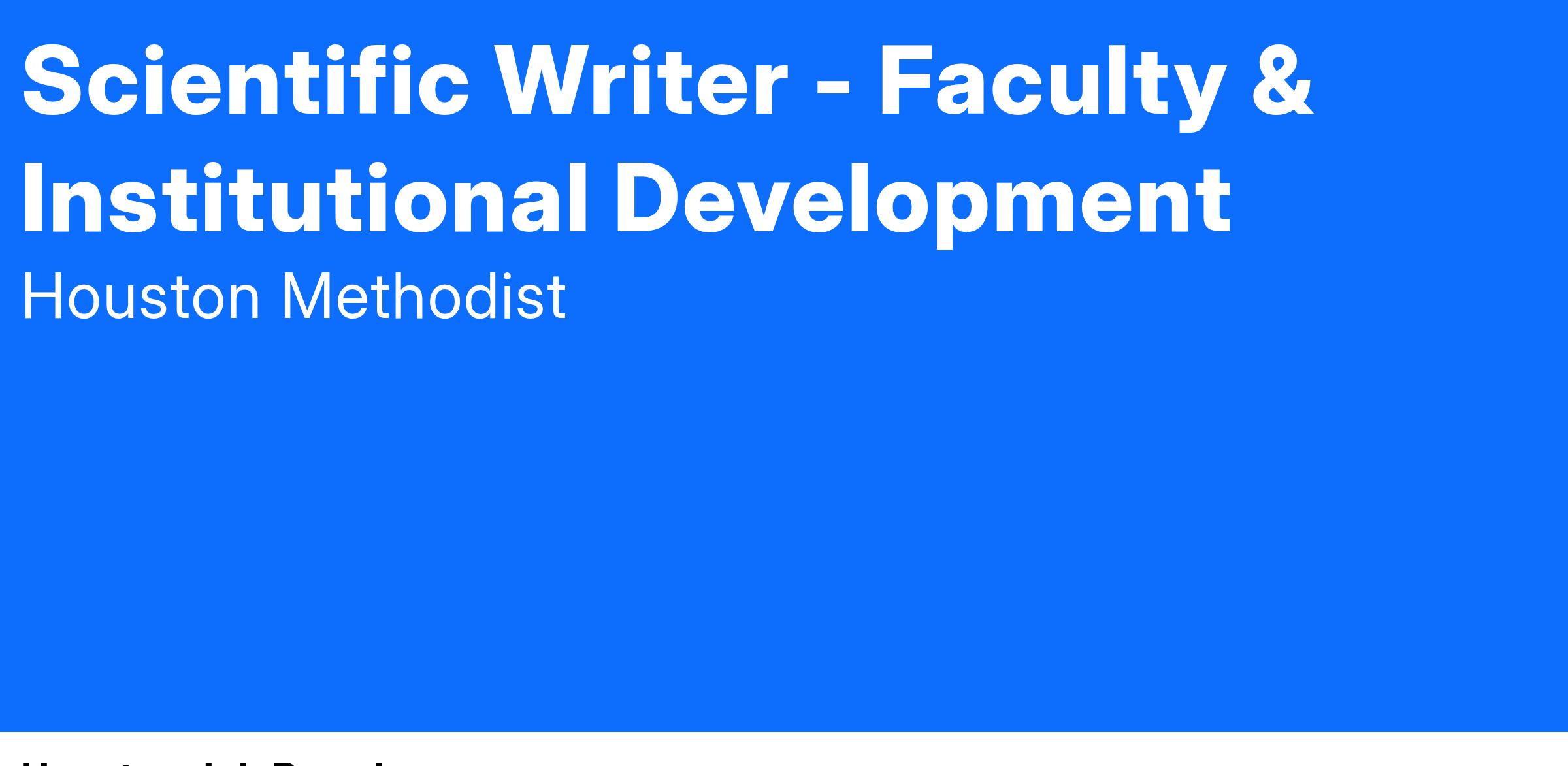 At Houston Methodist, the Scientific Writer contributes to faculty success by collaborating with scientific and clinical teams to coordinate, develop, edit, and review high-quality scientific writing deliverables including grant applications, peer reviewed publications, abstracts, clinical study protocols, executive summaries, and strategic and progress reports. The Scientific Writer also provides project management and ensures alignment of written documents with regulations, guidelines, and institutional priorities.Β