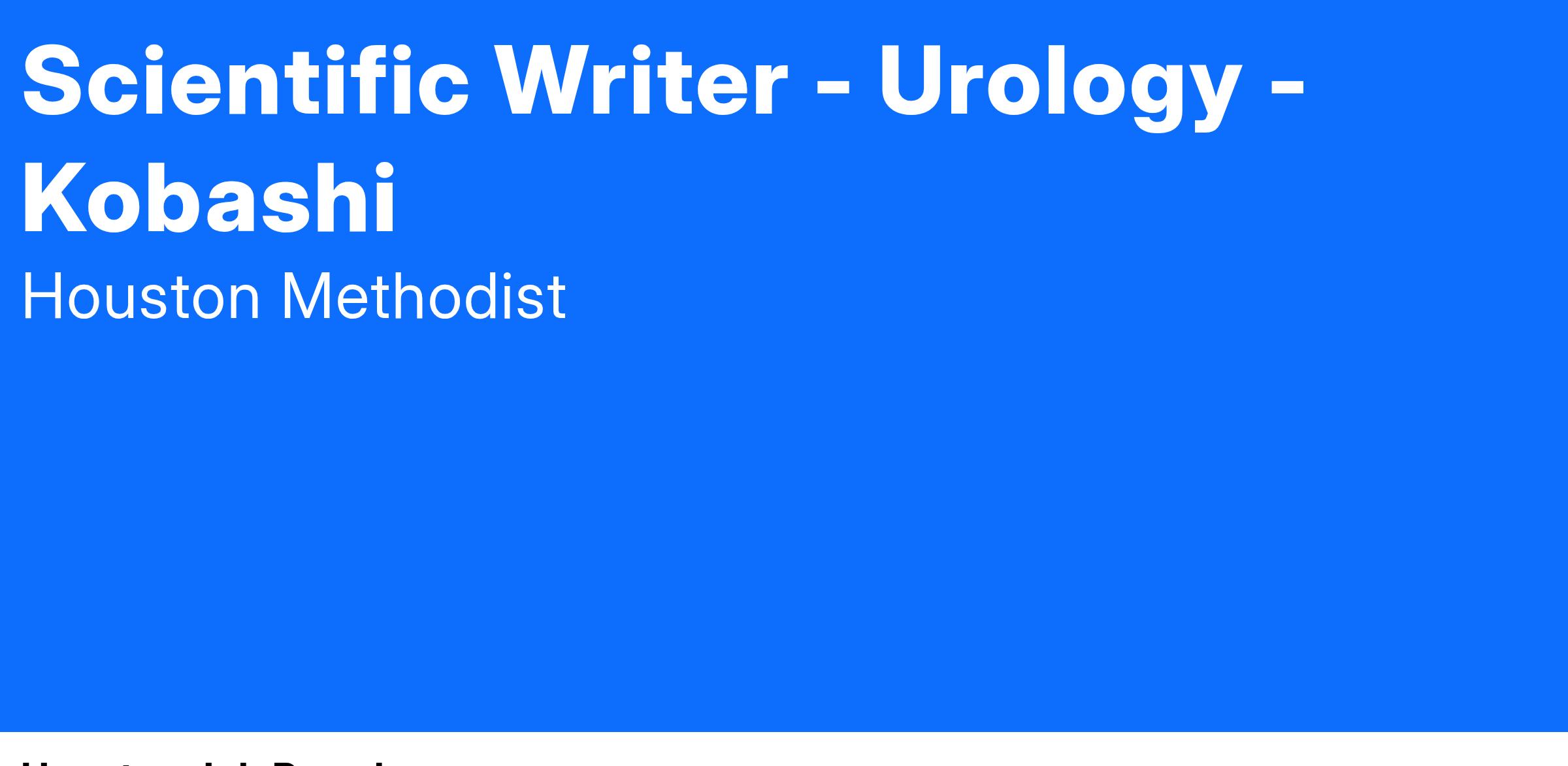 At Houston Methodist, the Scientific Writer position is responsible for performing a variety of tasks including preparing laboratory and clinical studies and documents for submission to journals and granting agencies. The position facilitates the gathering of noteworthy achievements in science within the department and helps translate and disseminate that information through feature articles, news releases, newsletters, social media and other communications venues.