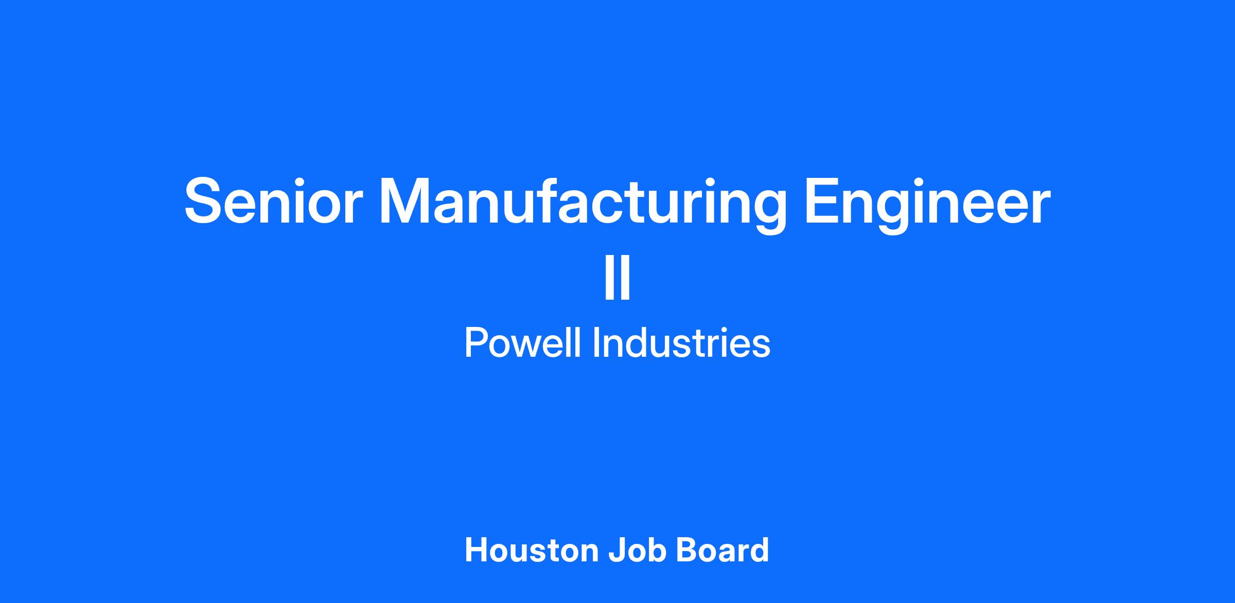 DescriptionPowell is hiring a Senior Manufacturing Engineer in Southeast Houston! Our Manufacturing Engineers are the process owners that design and improve processes and procedures used for the manufacturing of Powell engineered to order products. This position is required to identify and implement processes that improve safety, quality, and operating efficiency in a manner that supports the objectives of the Business Unit. Posted position does not allow for sponsorship.