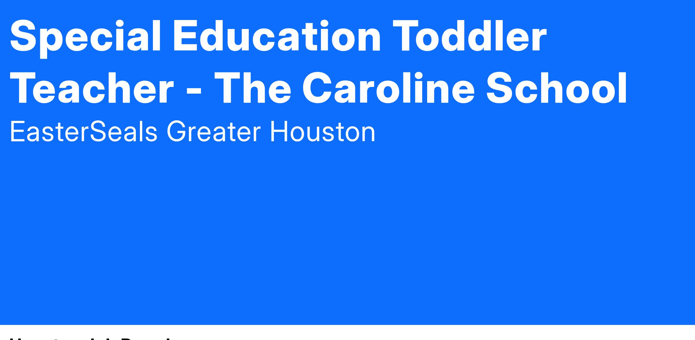 The Caroline School is looking for Special Education Toddler Teacher! Since 2002, The Caroline School has been providing unique educational services to meet the physical, social and cognitive needs of individuals ages 0-21 with multiple disabilities, including those who have additional medical needs. As part of Easter Seals Greater Houston, we are able to not only provide educational support for our families, but also therapy services, camps and play groups, respite and technology support. You can learn more about us by visiting CarolineSchool.org.