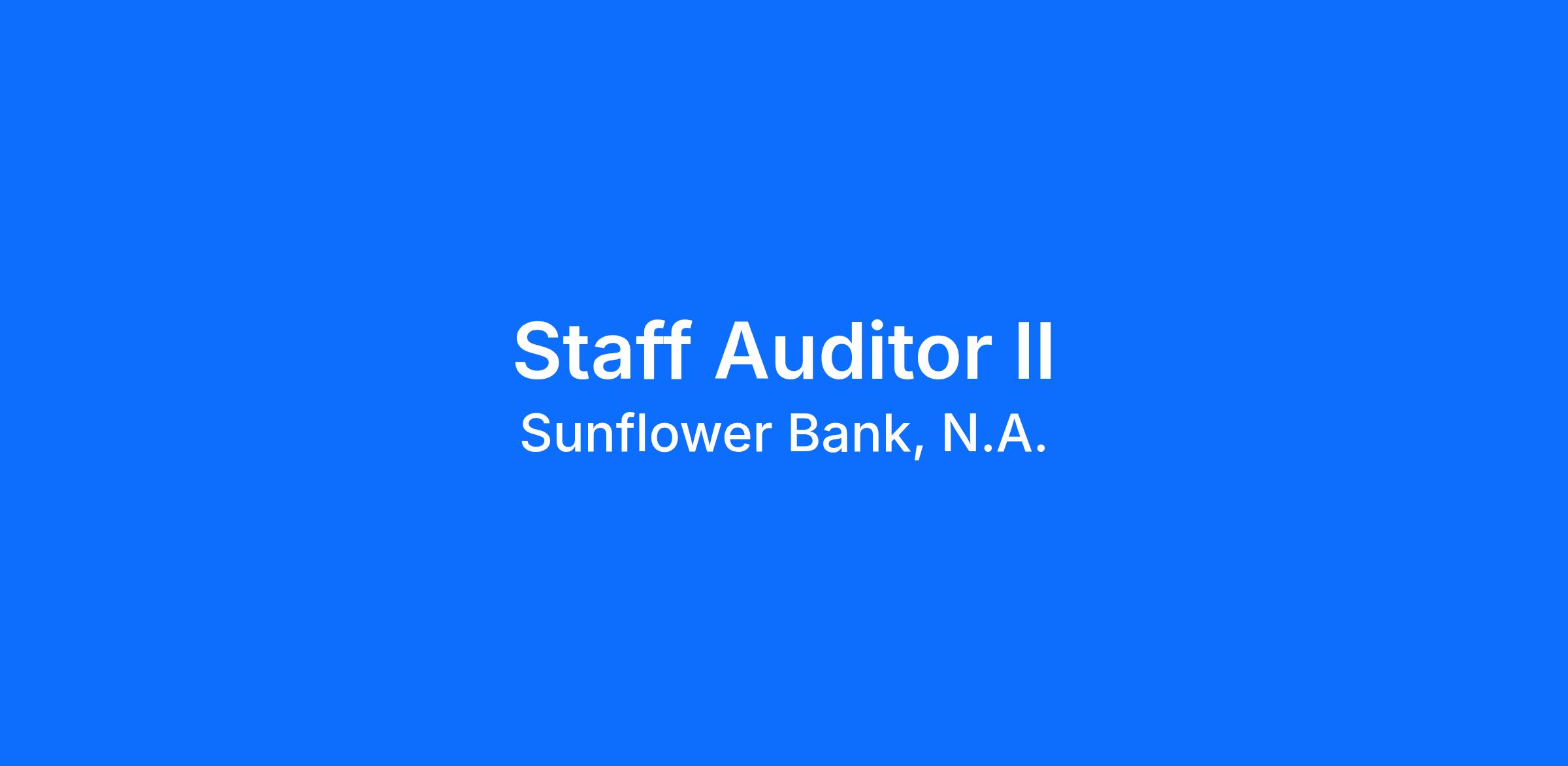 Sunflower Bank, N.A. is looking for an energetic, highly motivated individual to fill the position of full-time Staff Auditor II at our Houston, TX location.