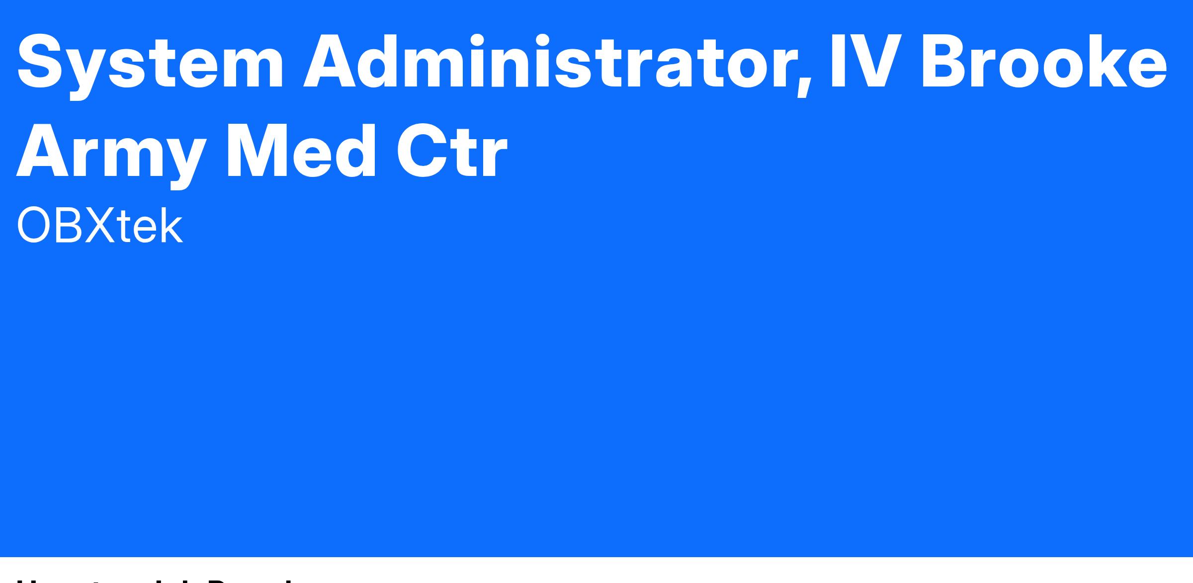 OBXtek is staffing for a System Administrator, IV position supporting DHA - Geographic Service Providers (GPS) - Brooke Army Med Center (BAMC) PEO - Medical Systems J-6 organization.