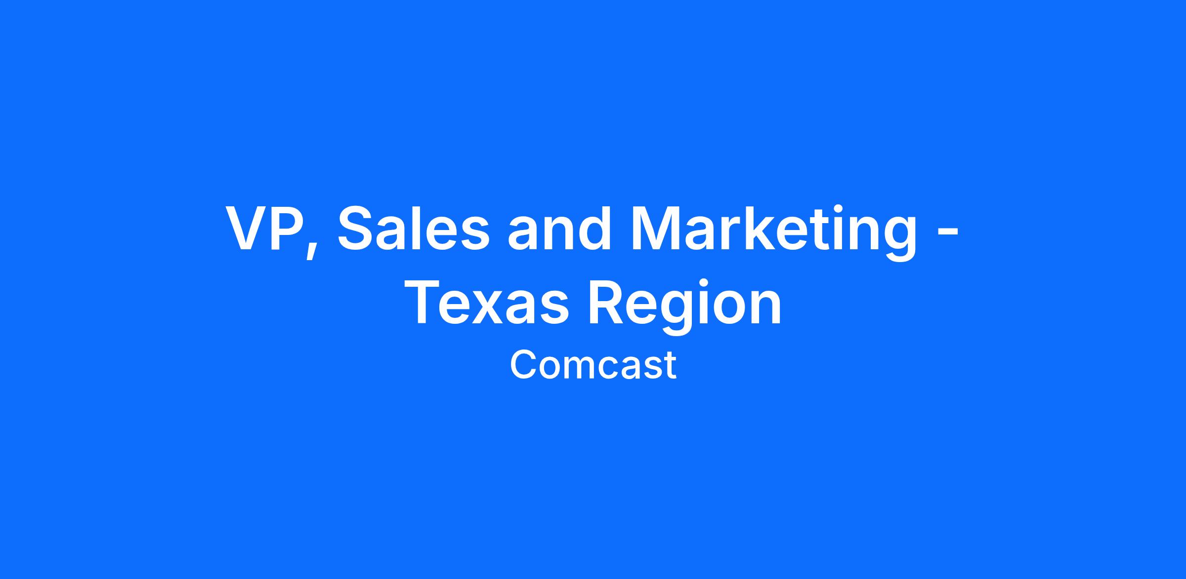 Comcast is seeking an inspirational and high-performing Vice President to lead the Texas Regionβs Sales & Marketing strategy and sales channel development to drive profitable subscriber and revenue growth. The Vice President is responsible for managing and influencing local marketing and sales channel strategy, business development, and tactics in alignment and coordination with division and corporate-led product strategy, marketing strategy and complimentary sales channels. The Vice President will champion the adoption of advanced technologies, including AI-powered tools such as Microsoft Copilot, to enhance productivity, streamline operations, and drive data-informed decision-making across sales and marketing functions.Job Description